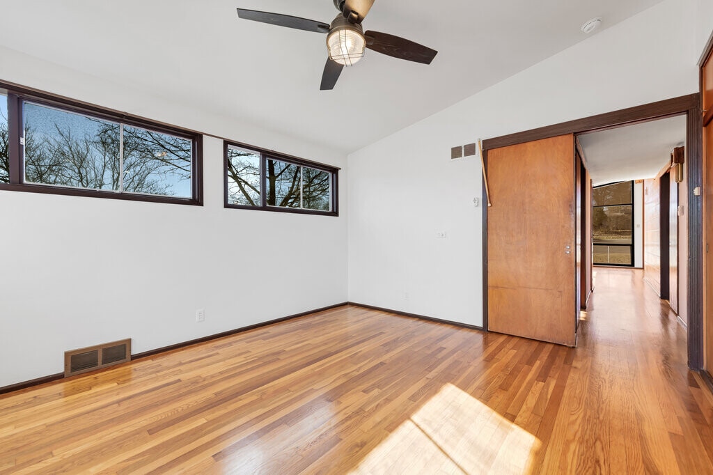 Move in ready Mid Century Modern 3 bedroom 1 bath Lindbergh Schools, close to Grants Trail. Very clean, refinished hardwood floors. Wood burning fireplace on main floor. Plenty of closet space. Much larger than it looks. One of the few Mid Century Modern Ridgewood Community Homes with a basement. The partially finished basement has a ventless gas fireplace. The basement could be used as additional sleeping area and office space. Walkout to patio. Backs to woods. Deposit of $1,000. Absolutely No Pets and No smoking. 1 Year lease required. Available 02/07/2026