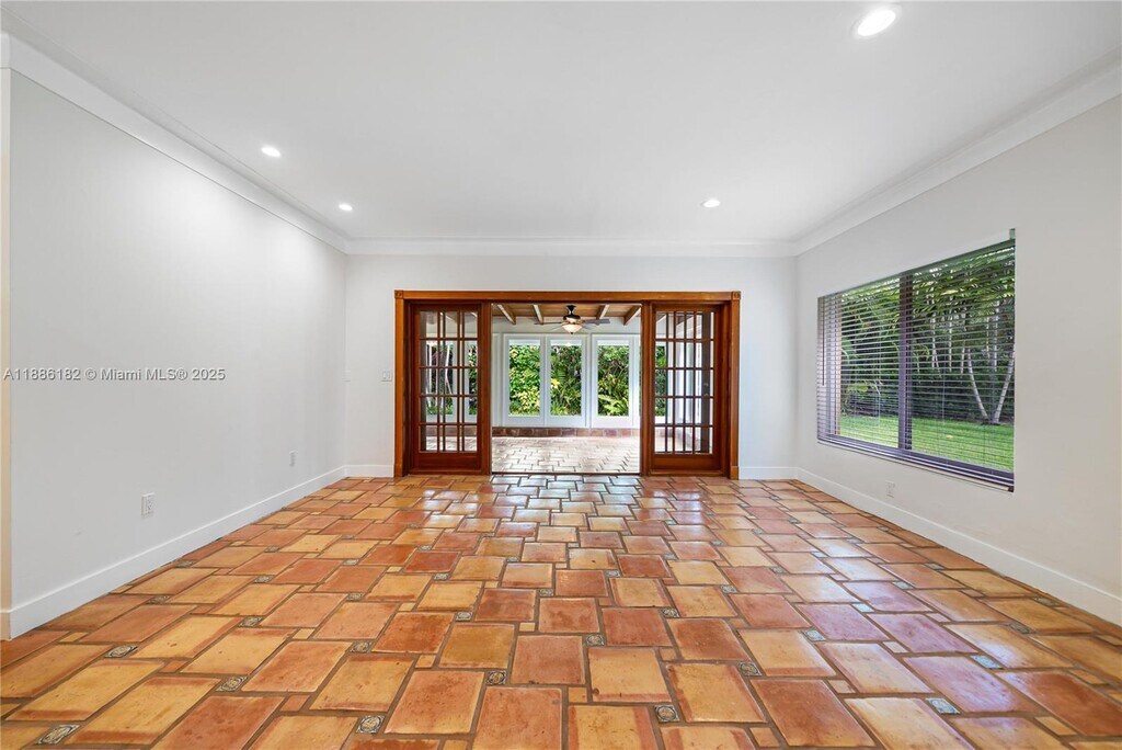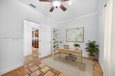Spacious and comfortable South Gables home with dramatic live oak welcoming guests. Terrific floor plan - spacious 3 bedroom + den, 2 bathrooms, 2,830 sqft. Features an open living room, dining room and very large Florida room. Lovely finishes include crown moldings, recessed lights, and French doors. The eat-in kitchen and bathrooms have been remodeled with marble, wood cabinets & granite. Home has impact windows and rolladen shutters for FL room. 2 car garage with laundry, sink, and gardener bathroom. This home sits on a massive 15,000 sq. ft. lot. The lush, private yard has a covered patio with Chicago brick walkways and plenty of grass for kids to play around on.