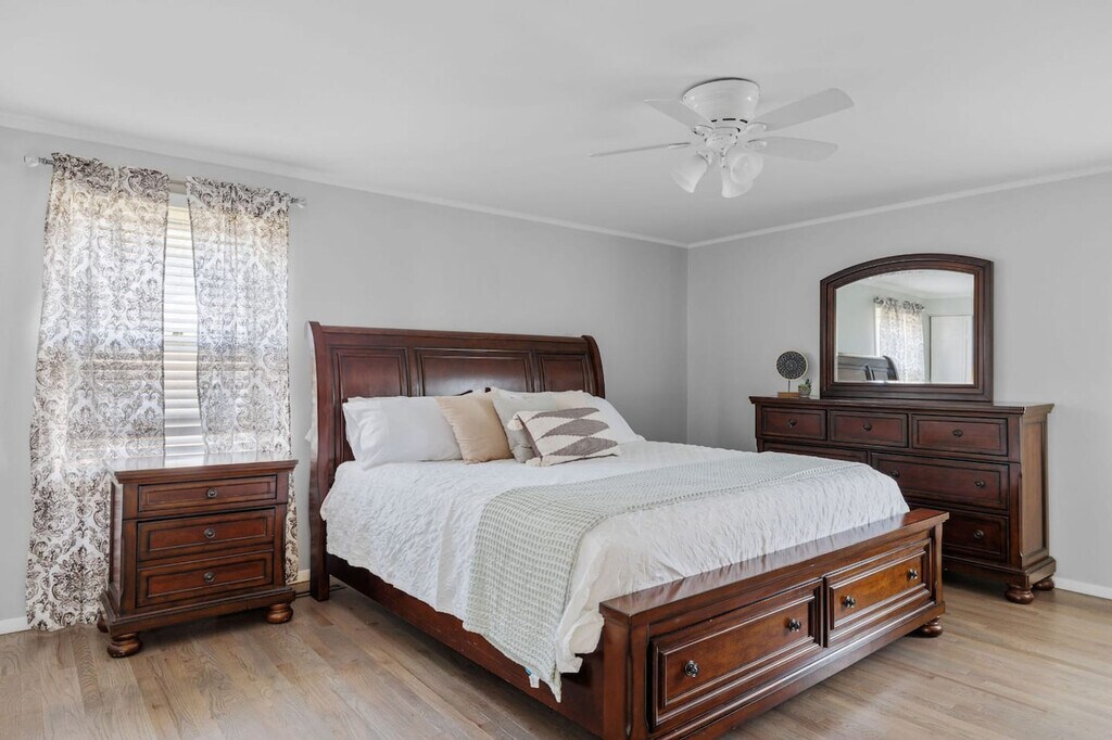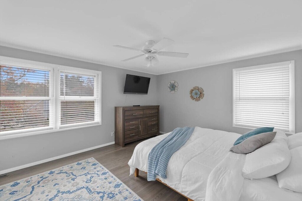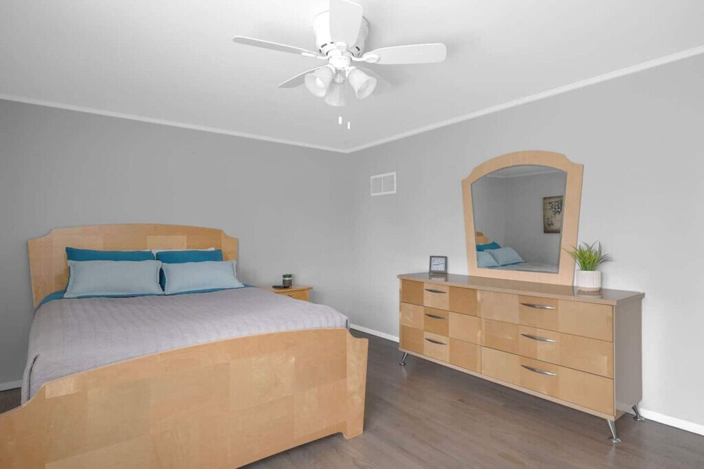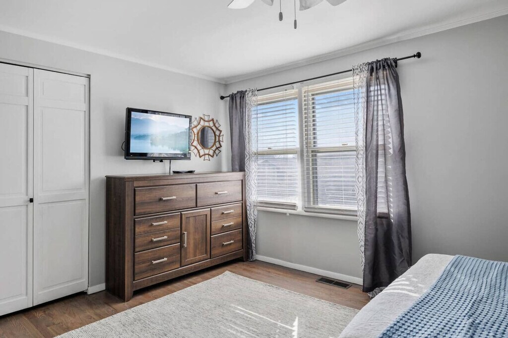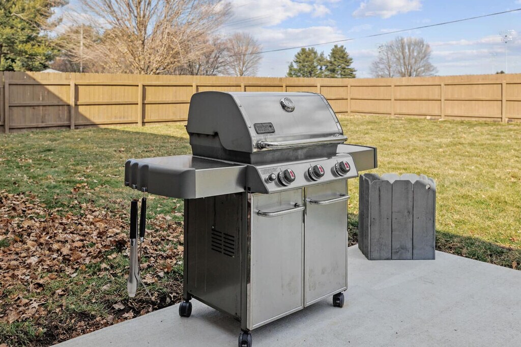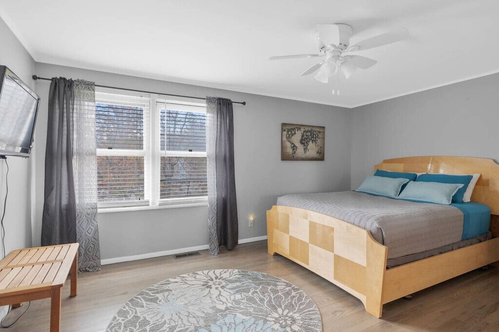 Feel at home in this spacious accommodation directly across from Kesling Park, which offers tennis courts and a walking trail. This home features five bedrooms and has been extensively remodeled with hardwood floors throughout. Note that the living room is sunken, so watch your step. This home offers a year-round hot tub located on an enclosed porch, providing a tranquil retreat for relaxation. The backyard includes a grill, patio furniture, and a fire pit, perfect for hosting gatherings. The laundry is located on the second floor hallway. The kitchen is fully equipped for your cooking needs. There are very few Ubers, Lyfts, and taxis available, so you will need a car to get around. Situated in a quiet neighborhood, this home is close to local restaurants and shopping. This is a quiet subdivision, so please respect the neighbors and keep noise levels down. No parties are allowed. If you don’t contact the host and the hot tub requires draining, cleaning, and refilling after your stay due to not following guidelines, a $200 fee will be charged. There is a security camera at the front door. Complete a pre-arrival form, upload a valid driver's license or passport, and sign and agree to rental conditions prior to arrival. If you use the hot tub, please place one chlorine tablet in the filter after each use. The hot tub is meant for 3-4 people at a time, with 1-hour time limits, no more than 2-3 uses per day. Guests should rinse off lotions and perfumes before entering the tub. Please follow the posted hot tub rules and let your host know if the hot tub looks murky. [SI]