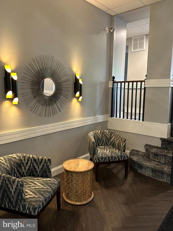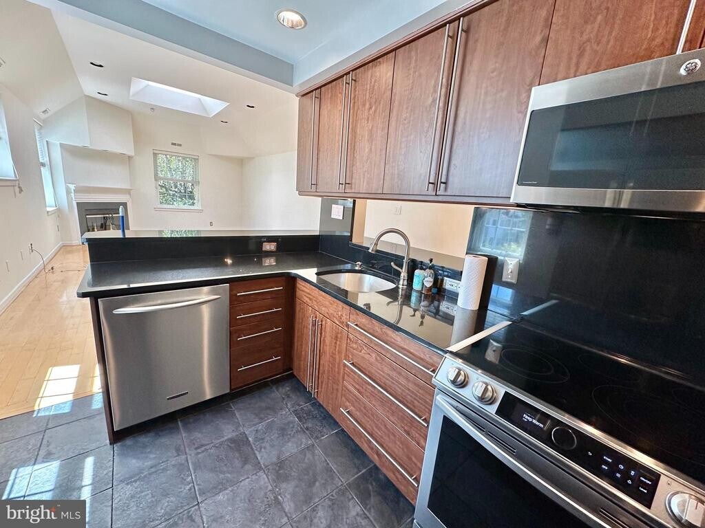 This awesome top floor, corner condo with 2 bedrooms, 2 bathrooms has high vaulted ceilings , a corner wood burning fireplace and a skylight. The fabulous kitchen has high end appliances and sleet looking granite countertops. It has a morning exposure along the length of the condo, then is cooler and shaded in the afternoon. The windows have handsome white blinds. The newer windows, hardwood flooring and easy location make this a fabulous place to call home. It is a short walk to trains, shopping at Suburban Square with a large Farmers' Market, Trader Joes, restaurants and all the amenities you want to enjoy. This condo complex has lush landscaping and an inviting pool for dips on hot summer days. There is a washer & dryer, gas heat, central air and renovated closet space. The balcony is shared and faces a quiet wooded area. Parking is an assigned spot. Square footage of 1106 is from condo docs. Owner desires a longer term tenant. The building is a No smoking property and neither are pets are permitted. Due on signing: first, last and security deposit. The condo association requires move in/out fees currently each of $150. Lease available to start November 30, 2025.
