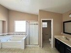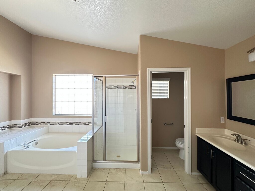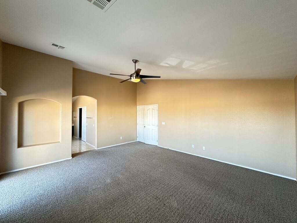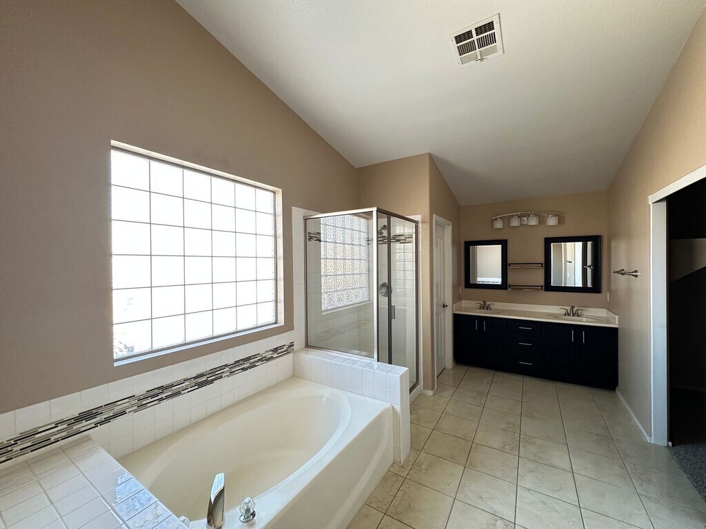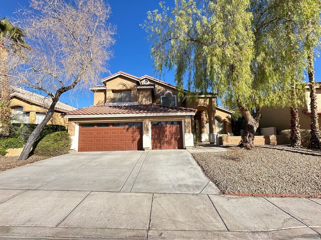 Attractive and spacious 5 bed, 3.5 bath home in desirable Summerlin featuring an open floor plan with vaulted ceilings and tile/carpet throughout. Downstairs includes separate living room, family room, and den. Kitchen offers stainless steel appliances, walk-in pantry, and breakfast bar/island. Primary suite includes double sinks, soaking tub, walk-in shower, and balcony access with great views. Upstairs loft provides additional living or office space. Large backyard with with mature landscaping that also includes a covered patio. Price includes $50 a month for trash and sewer.