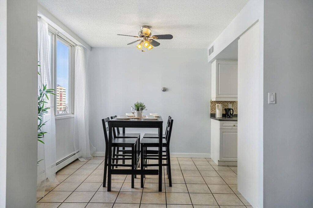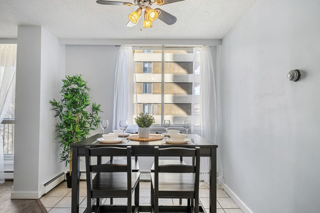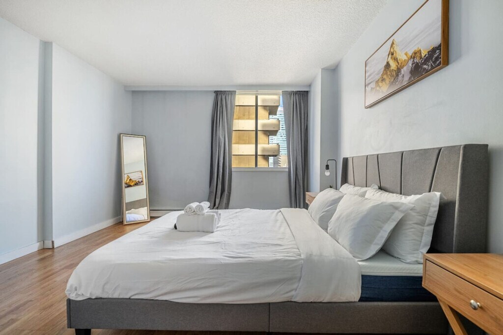 Feel at home in this beautiful and cozy apartment with downtown views, perfect for a couples or friends/family getaway for up to four people. This centrally located apartment offers a transit score of 90, making it a commuter's dream, and a bike score of 90, ideal for cycling enthusiasts. Enjoy the convenience of a free parking stall and visitor parking, along with self check-in for a seamless arrival experience. This spacious apartment features a fully equipped kitchen, a queen bed, and a queen sofa bed, accommodating up to four guests comfortably. Relax in the living room with a 65” Smart TV equipped with Netflix, and stay connected with fast Wi-Fi at 250+mbps. Enjoy complimentary drinks including tea, water, wine, and coffee, and make use of the Keurig coffee machine for your morning brew. The apartment also includes a travel crib and high chair for families traveling with young children. Guests have exclusive access to a complete gym with the latest exercise equipment, a sauna, a pool table, and a table tennis entertainment room. Additional amenities include luggage storage and a portable AC unit. Essential supplies are provided to help you settle in comfortably, with additional replenishments available at an extra cost. Located just minutes from Jasper Ave, Rogers Place, and the University of Alberta, this apartment offers easy access to some of Edmonton's top attractions. The Royal Alex Hospital is an 8-minute drive away, while the West Edmonton Mall is a 20-minute journey. For those traveling further afield, the Edmonton Airport is a 35-minute drive from the apartment. The apartment enforces a strict no-smoking policy, with a $250 CAD fine for any violations. Quiet hours are from 10 pm to 7 am, and noise should be kept under 85db to avoid complaints. Unauthorized late check-outs will result in additional fees. Guests are responsible for following city guides on garbage, recycling, and composting, with fees for any infractions. No parties, drugs, excessive drinking, or loud music are allowed, although events for work or meetings can be arranged upon request. A strict complaint policy is in place, with eviction after the second complaint. Please remove outdoor shoes while inside the home and exercise caution on the balcony, supervising children at all times. The use of the mailbox is not included, but a PO box can be arranged for a fee. Guests are responsible for any damaged linens, towels, utilities, or equipment upon check-out, with fees claimed through the booking platform. The apartment is remote work-friendly with fast Wi-Fi, making it easy to stay connected and productive during your stay. [SI]