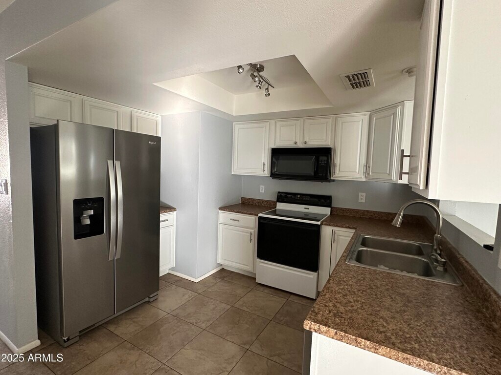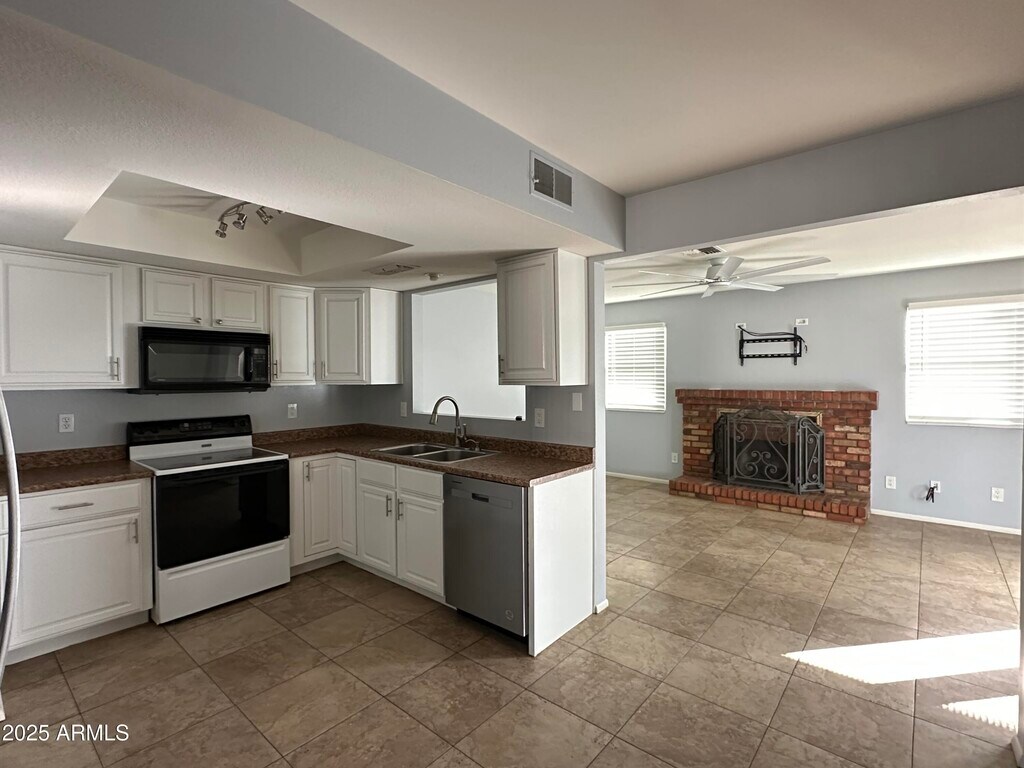 AVAILABLE NOW! This charming 3 bedroom Country Meadows home features soothing 2 tone grey and white paint with neutral tile and plush carpeting. Kitchen features lots of white cabinets with stainless steel hardware,and all appliances. Ceiling fans for year round comfort,and a cozy fire place for chilly winter days. Lovely outdoor space with easy to maintain desert landscaping,big covered patio and additional uncovered patio. Plenty of PARKING with 2 car garage and RV GATE for private backyard parking/storage with no HOA. Small well trained pet welcome.
