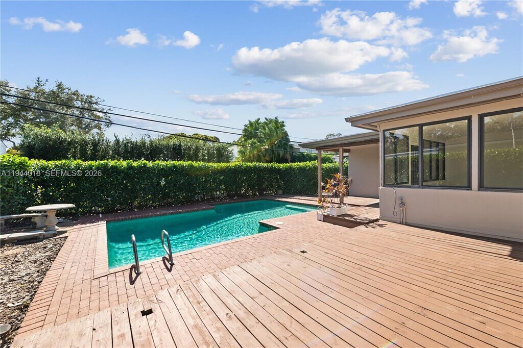 Amazing RENTAL OPPORTUNITY in East Miami Shores. Spacious layout is LARGER than tax records - 2,047 SF Living (See building sketch). This classic 3 bed/2 bath gem is nestled on a tree-lined street in one of the most desirable pockets. Split floor plan features original Dade Pine wood floors, impact windows, & a sun-drenched Florida room— perfect for relaxing or entertaining. Lounge by the sparkling POOL & covered deck, surrounded by lush landscaping. One-car garage with private alley access offers flexibility for parking, storage, or expansion. Great natural light & a warm, welcoming vibe. Just a short stroll to wide-open Biscayne Bay & minutes to top-rated schools, restaurants, beaches MLS # A11944018