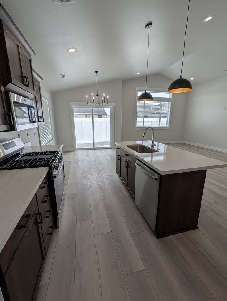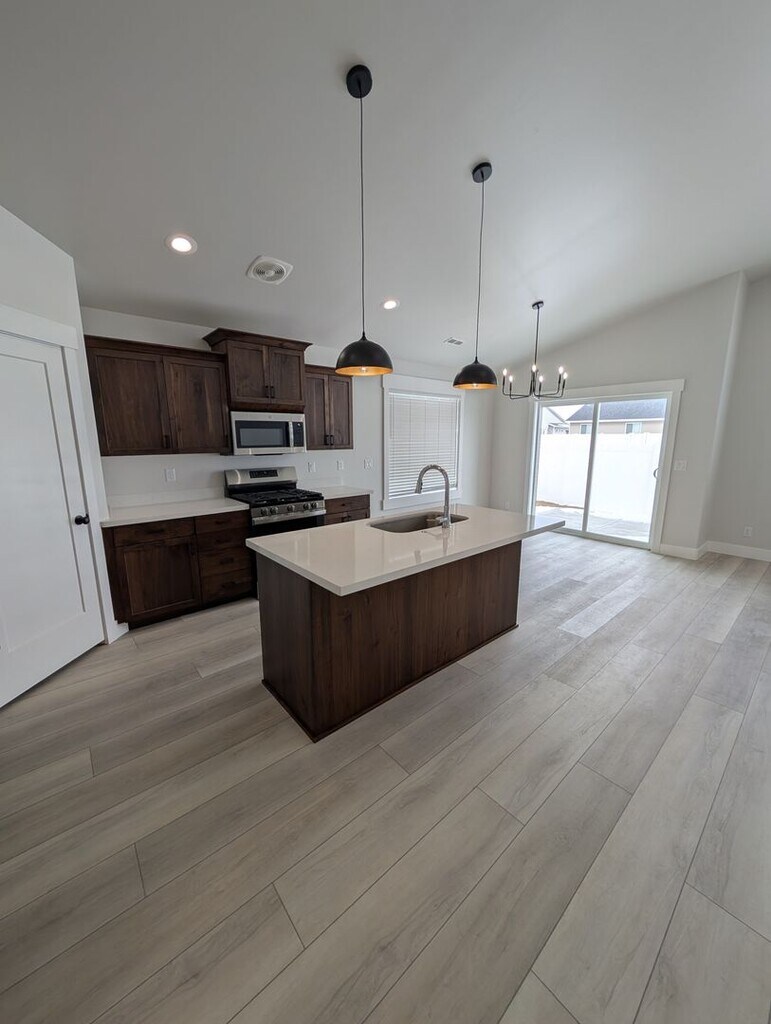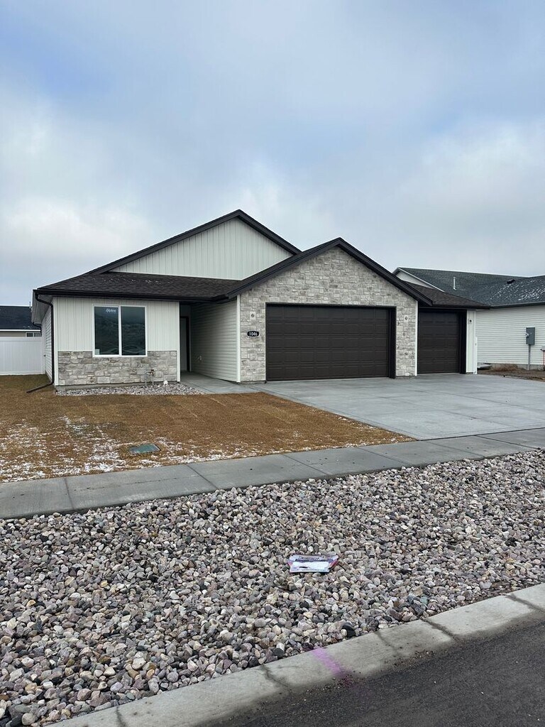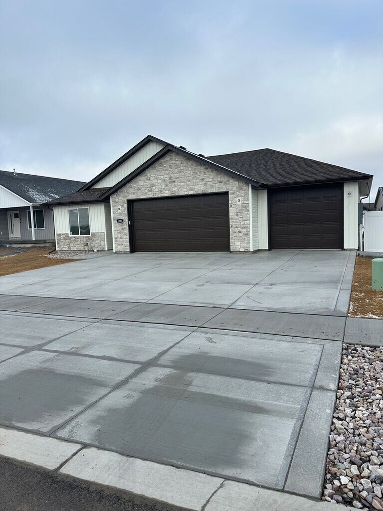 Beautiful Move -in ready new construction 4 bedroom, 2 bath open concept home all on one level. This home is detailed from top to bottom. Custom hickory wood tone kitchen cabinets, with white quartz counter tops, upgraded appliances including gas stove with over the range microwave and side by side refrigerator with icemaker. Warm rich tones throughout with luxury vinyl and carpet in bedrooms. Gas heat, a/c, washer/dryer hookups, water softener, automatic sprinklers, fenced yard, 3 car garage and more. $2400.00 per month, $1150.00 security deposit OAC. Nonsmoking property, dog friendly up to three dogs with pet references.