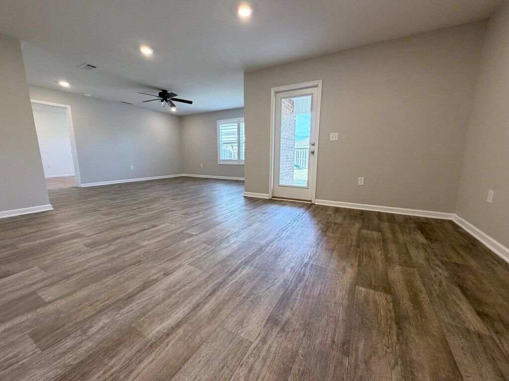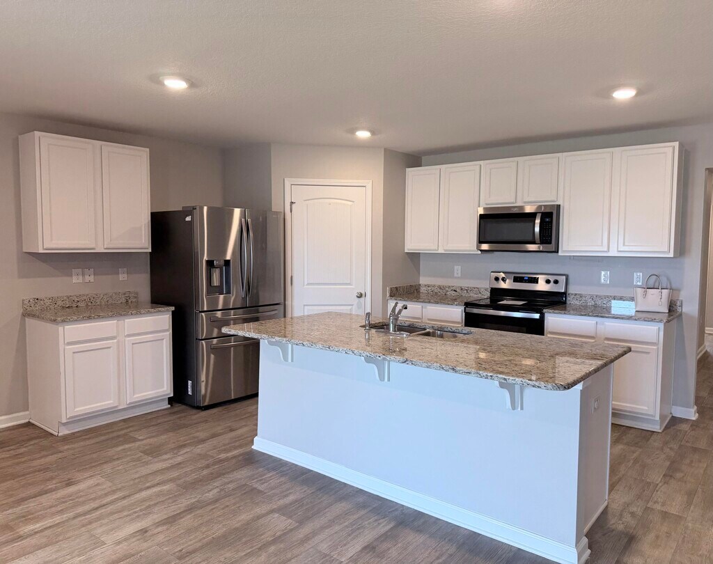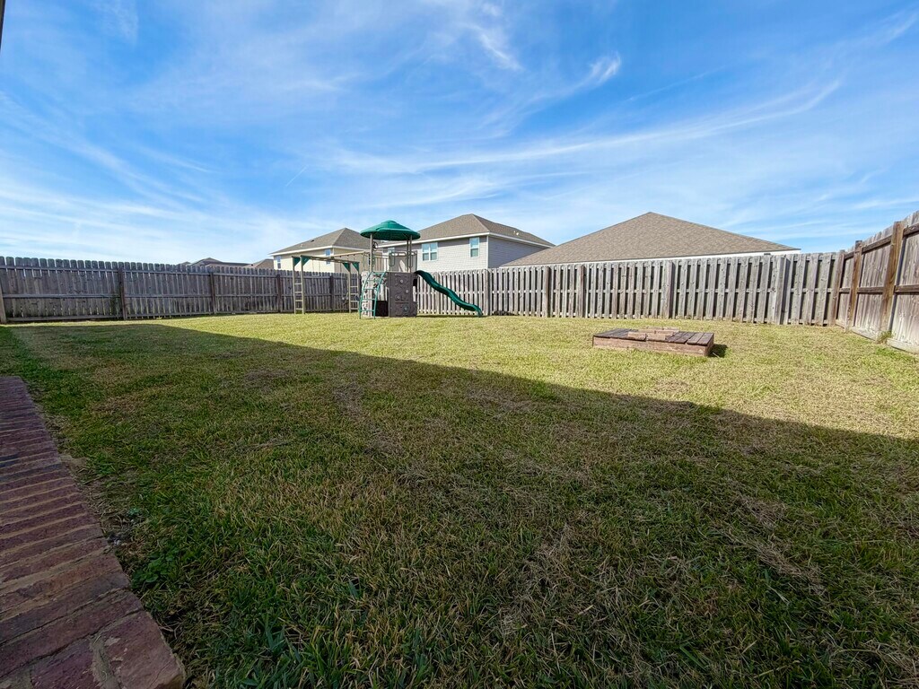 This home includes a resort style pool, clubhouse, and playground. The property offers 4 bedrooms and an open kitchen floor plan with granite countertops and stainless steel appliances. Vinyl plank flooring runs throughout main living and baths, with carpeted bedrooms. Roomy master bedroom with en suite features double vanities and large walk-in closet. custom plantation shutters, gutters, sprinkler system, and fully fenced backyard. Washer/dryer and jungle gym included as is, Owner will haul away if not wanted/needed.