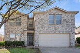 Two-story brick home in suburban North Forth Worth neighborhood with covered porch, open patio, wood fence, garden tub, separate shower, walk-in closets, island kitchen, wood burning fireplace, gas heat, gas water heater, and ceiling fans