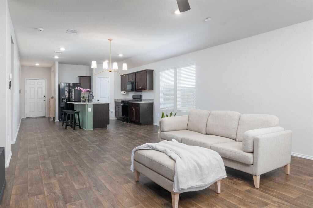 Step into a turnkey lease with this meticulously maintained 4-bedroom, 2 full bath home, built in 2022, and nestled on an oversized corner lot. This turnkey residence is fully equipped with premium features, including three wall-mounted Smart TVs equipped with Amazon Fire Sticks, a washer and dryer, two refrigerators, and premium blinds throughout the home. The advanced security system with ADT capability, just sign up for service, along with a door camera and coded door lock, provides enhanced peace of mind. The beautifully designed built-out living area is ready for your fireplace insert, creating a perfect centerpiece that adds both warmth and style to the space. The updated master bath is a true retreat, featuring a frameless walk-in shower, gorgeous hardware and faucet updates and a huge walk-in closet. This home showcases modern finishes throughout, including a stylish barn door to the master bath, contemporary lighting, and chic fixtures. The front and back porches have been coated with epoxy for a polished look. Outside, you'll find an oversized backyard with a charming garden, providing a peaceful space to enjoy the outdoors. The garage also features an epoxied floor for added durability and a sleek finish. You'll also enjoy the added benefit of soft, great-tasting water, thanks to the installed water softener and filtration system. For those who love being at the heart of it all, this home is perfectly positioned between Austin and San Antonio, offering a quick 5-minute commute to Texas State University San Marcos. Enjoy easy access to the beautiful Blanco River and explore over 2,100 acres of natural areas, part of the City of San Marcos’s expansive parks and recreation offerings. The vibrant Cottonwood community amenities, including walking paths, a playground, and a splash pad, make this location ideal for an active and connected lifestyle. MLS ID 3078419