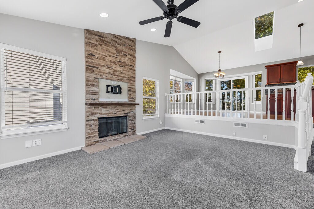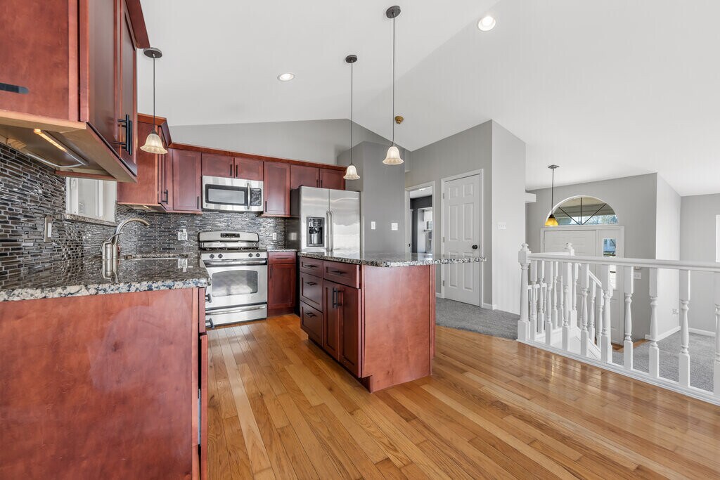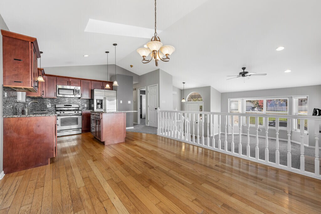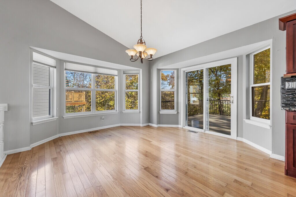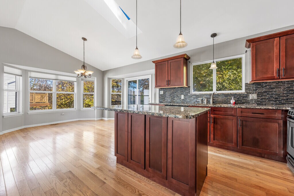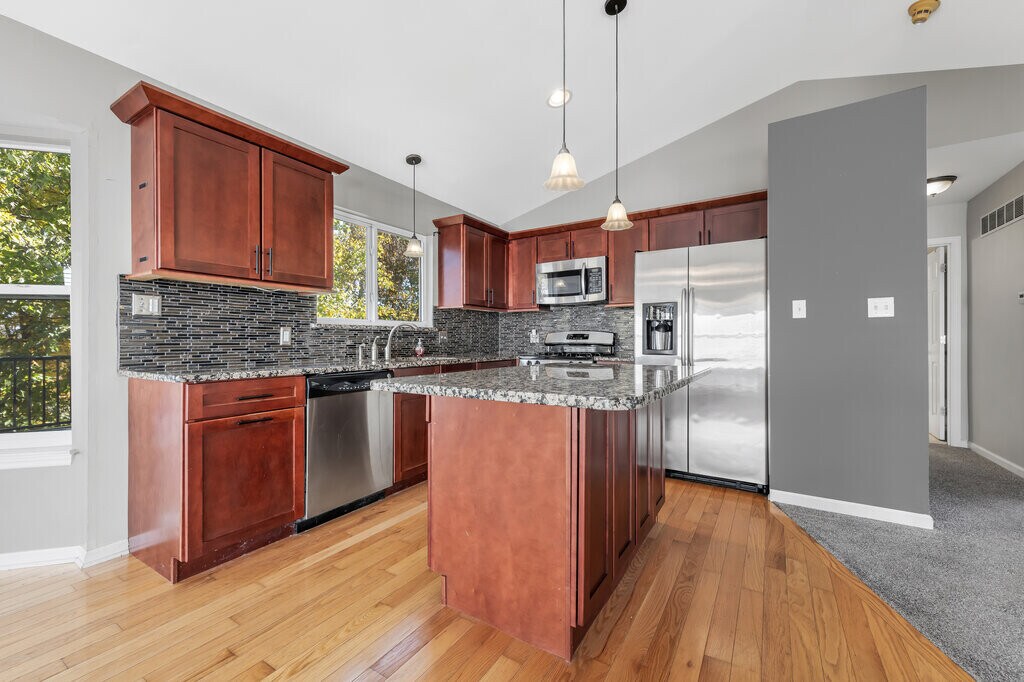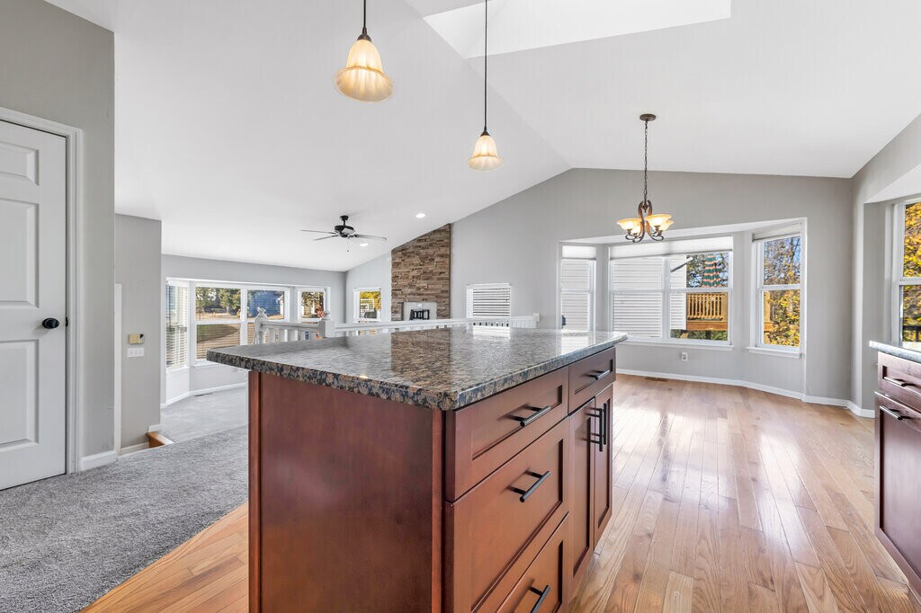 Unique floor plan with 2 bedrooms and 1 full bathroom on the main level, vaulted ceilings, skylights, open kitchen with granite countertops, custom cabinets, a breakfast room, wood-burning fireplace and a gorgeous deck. Lower level feature a full bath, laundry room and 2 rooms, one of which could be a 3rd bedroom. Walkout lower level. 2 car garage. Gorgeous deck that backs to woods! Home is on a cul-de-sac!