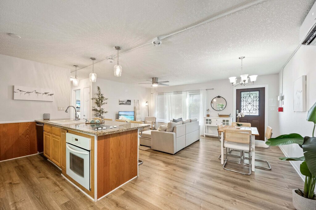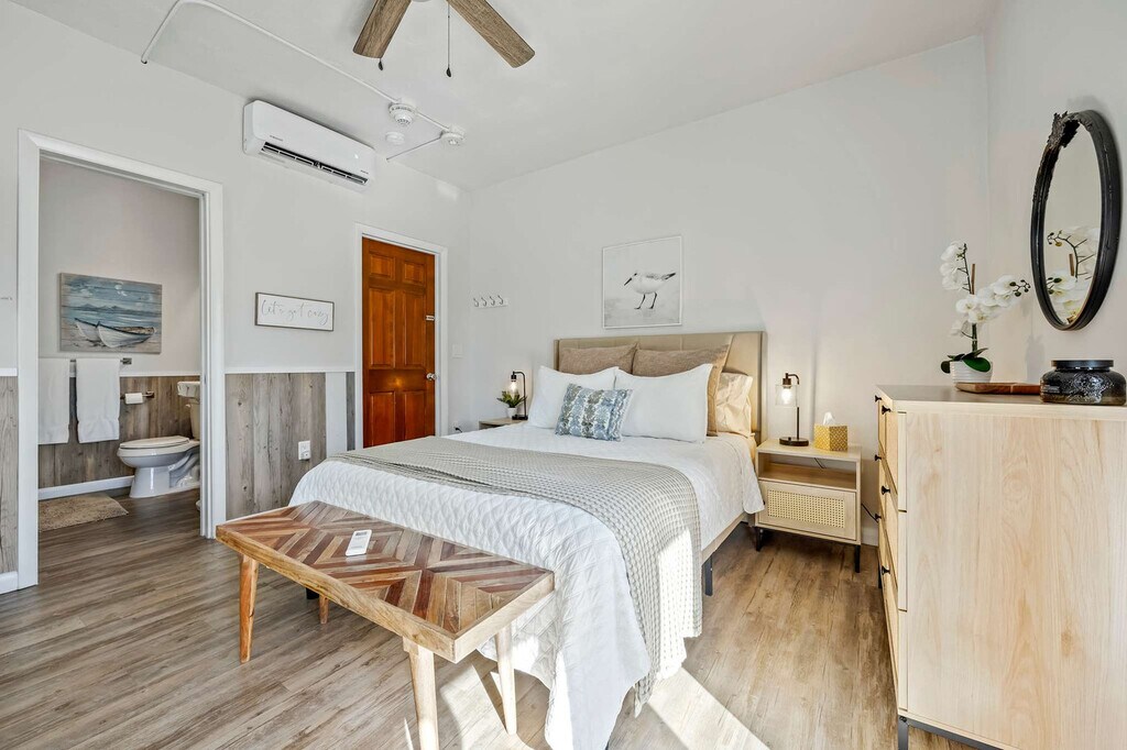 Welcome to this newly renovated 4-unit boutique property in Satellite Beach, just steps away from the famous sugar-sand beaches. This property serves as the perfect home base for a relaxing vacation, offering a total of five bedrooms and four bathrooms across four distinct units. Each unit is thoughtfully designed to provide comfort and convenience, ensuring you feel at home during your stay. The property features four unique units: Unit A includes a queen bedroom and sleeper sofa, Unit B is a studio with a queen bed and kitchenette, Unit C offers a queen bedroom, a bedroom with two twin beds, and a sleeper sofa, and Unit D includes a queen bedroom and sleeper sofa. Enjoy high-speed Wi-Fi and a smart TV in each unit, beautifully landscaped exteriors with seating, and on-site parking for your convenience. While we love all furry friends, only dogs are allowed at this property with a fee of $100 per pet per stay. Nestled in the charming seaside community of Satellite Beach, this vacation rental is perfectly situated just steps away from the pristine Atlantic shoreline. Wake up to the soothing sound of waves and enjoy morning beach walks or afternoons basking in the sun. The area offers a laid-back coastal vibe with locally loved spots like Hightower Beach Park and Pelican Beach Park nearby. A short drive takes you to unique eateries, boutique shops, and the vibrant Space Coast attractions. Whether you're here to surf, explore wildlife, or simply unwind by the ocean, this location has something for everyone! The property offers a self check-in process, and a local management company is nearby to assist with any needs. Mailbox access is not available for guests. An initial stock of essentials such as paper towels, toilet paper, tissues, coffee pods, creamer, sugar, light cleaning supplies, garbage bags, sponges, dish soap, and dishwasher tabs is provided, but guests are expected to replenish these as needed. No laundry soap is provided. All reservations require either a refundable security deposit or the purchase of a damage waiver. Each unit is equipped with high-speed Wi-Fi, making it easy to stay connected or work remotely if needed. A laptop computer is not included. [SI]
