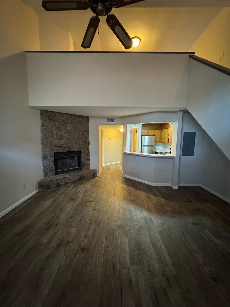 Two-story townhome with 2 bedrooms, 2 baths and bonus loft space. Features vaulted living room with rock fireplace open into kitchen via breakfast bar. Kitchen feautres fridge, electric range, dishwasher. Bedroom and bath located on each level of the town home with upstairs bedroom opening on to balcony. Nice deck. Central heat & air. Total electric. Property has only 3 immediate neighbors. No Section 8. No College Students. No pets.