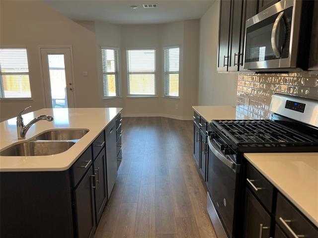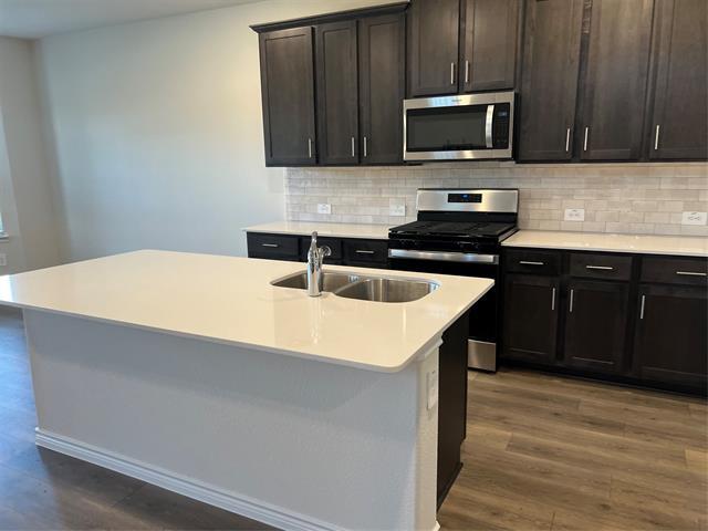 Beautiful home located in the sought after neighborhood of Silverado West. This home features an open floor plan with an abundance of natural light. Luxury vinyl found throughout the living area, carpet in the bedrooms and tile in the bathrooms. Living room boasts a gas fireplace which is open to the kitchen and breakfast room. The kitchen has an island, quartz counters, SS appliances, huge pantry and lots of cabinet space. From the breakfast room you have access to the large backyard with a covered porch. The owner’s retreat is on the first level with an ensuite bath, double sinks, separate shower and large closet. There is another bedroom on the first level, which could be used as an office. Game room is located on the 2nd level with two additional bedrooms and a full bath. Amazing amenities! Large pool, splash pad, playground, walk and bike trails. Close to shopping, restaurants, schools and easy access to 380.
