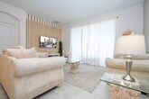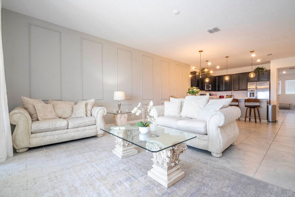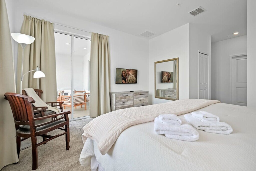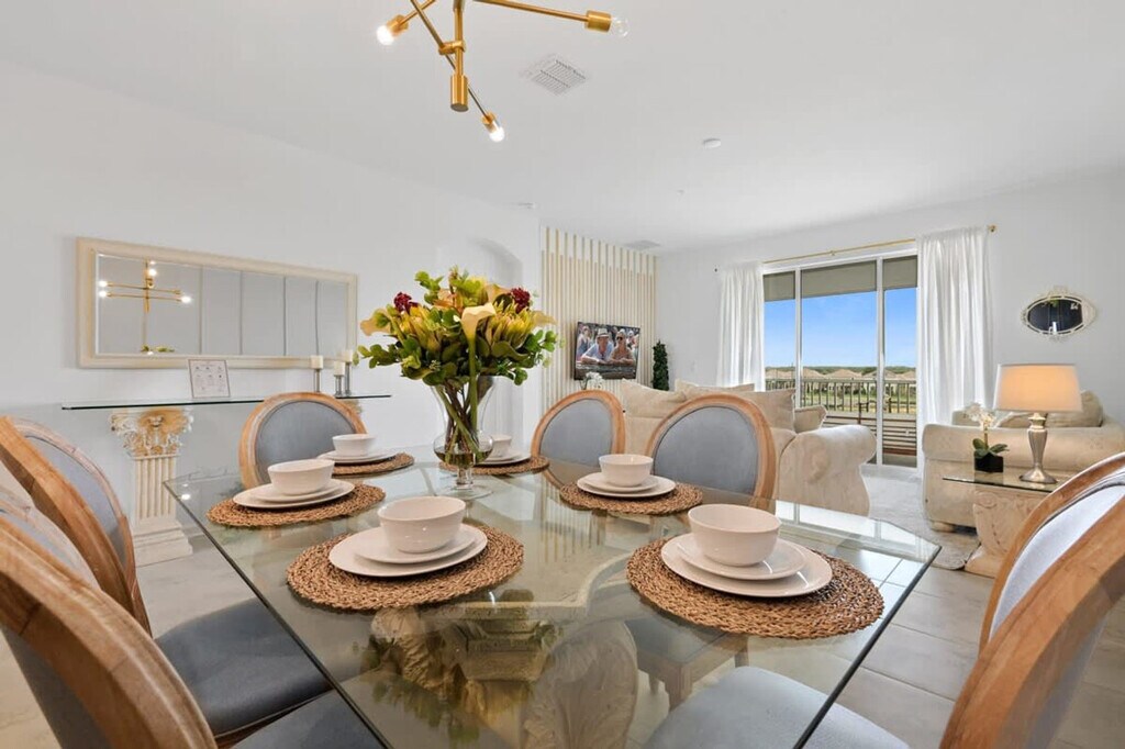 Feel at home in this amazing 3-bedroom apartment located at the luxurious Champions Gate resort. With a special Mickey-themed bedroom and ample space for up to 8 guests, this apartment offers a delightful stay. Enjoy all the amenities of the resort's SuperClub, including a pool with a slide and lazy river, fitness center, game room, restaurant, and more. This is a great spot for an incredible vacation filled with fun activities and entertainment. This comfortable and spacious 3-bedroom apartment is the perfect getaway for families or groups of friends. The fully equipped kitchen seamlessly integrates with the cozy and inviting living and dining room, allowing conversation to flow easily. The apartment also includes a great balcony with breathtaking views. The master bedroom is equipped with a king-size bed and great views, while the other two bedrooms feature a full bed and twin beds each. There's a Mickey-themed bedroom sure to delight all ages! These bedrooms share a bathroom. This apartment also has a laundry room, free Wi-Fi, a covered garage, and a welcome package of basic bathroom and kitchen supplies for extra convenience. You'll surely be impressed by the perfect combination of comfort and convenience this apartment has to offer. The apartment includes a covered garage and a welcome package of basic bathroom and kitchen supplies for extra convenience. Replenishment of bathroom and kitchen amenities is the guest's responsibility. Champions Gate Resort is a resort-style community offering every imaginable amenity for a blissful stay. It features an impressive clubhouse with a variety of courts and outdoor activities like tennis, beach volleyball, and a golf course. The restaurant and fitness center will help you stay refreshed and fit. Its swimming pool complex is perfect for a splashy day, with slides, a lazy river, and a kids' splash pool. Plus, the resort is just 20 minutes away from Disney Parks, ensuring plenty of opportunities for fun and adventure. Shopping, dining, and entertainment are also within reach, with stores, restaurants, and supermarkets nearby. It's the perfect place for a family getaway; come and experience all the perks of Champions Gate Resort! Quiet hours are between 22:00 and 8:00.