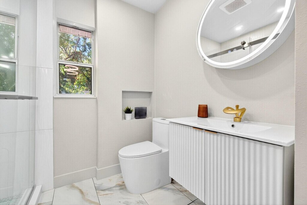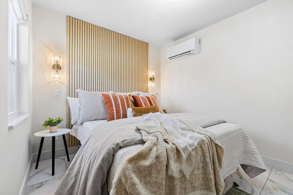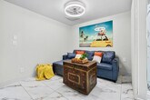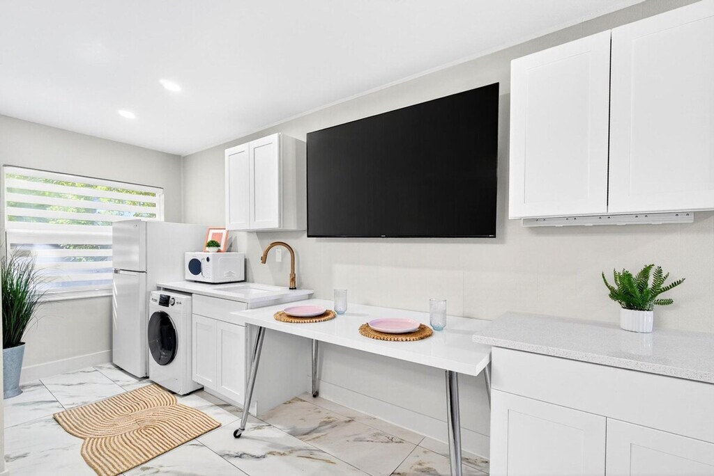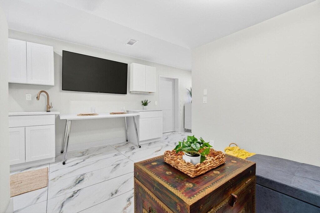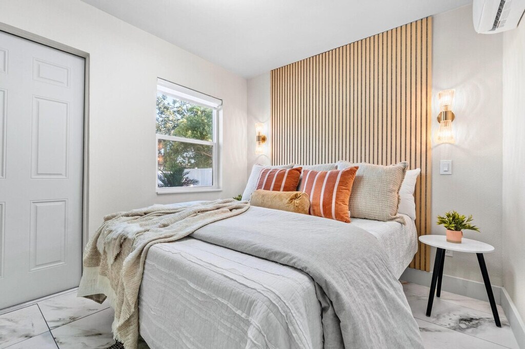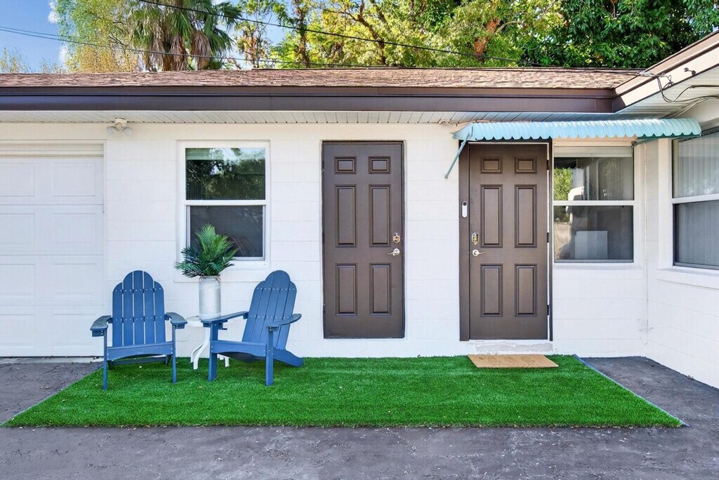 Feel at home in this newly renovated 1-bedroom cottage, offering a bright and cozy beachside retreat. This coastal retreat offers a bright, open layout with stylish decor and marble-look tile flooring. The cozy bedroom features a plush queen bed and hotel-quality linens. The living area includes a comfy sectional with a pull-out, colorful splashes, and a large smart TV. The sleek kitchenette is fully equipped with a full-size fridge, double burner stove with convection cookware, microwave, coffee maker, sink, dishes, and a dining table. An in-unit washer/dryer combo unit is included for your convenience. The spa-inspired bathroom features an oversized glass-enclosed shower with beautiful tilework and modern fixtures. Guests have private access to the entire apartment, including a private entry door, a private outdoor seating area with Adirondack chairs, free on-site parking, and high-speed Wi-Fi. Shared spaces include the outdoor BBQ grill and spacious yard. Long-term stays are welcome. Located in a peaceful residential neighborhood just minutes from Madeira & Redington Beach, this apartment offers quick access to local restaurants, coffee shops, waterfront parks, and boutique shopping. The studio is attached to the main home but is fully private with its own entrance. This apartment is perfect for couples, solo travelers, or business stays. [SI]