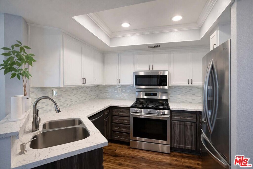 Brand New Viewpointe Gem! Stunning Plan 3 upper-level end unit with a rare two-car attached garage and breathtaking city lights, sunset, and mountain views. This beautifully upgraded 2-bedroom, 2-bath home features two private balconies off the spacious living room and primary suite. Light and bright throughout with fresh designer paint, newly added recessed lighting in the living and dining rooms, Luxury AquaGuard Belle Isle plank flooring, upgraded baseboards, custom fireplace mantle, wood plantation shutters, new sliding doors, and mirrored wardrobe doors. Newer energy-efficient heating and A/C systems.Fully remodeled kitchen with Silestone countertops, glass tile backsplash, stainless steel appliances, and custom cabinetry by Reborn. Upgraded bathrooms include new vanities, designer vessel sinks, modern toilets, and updated shower doors. A newly installed full door frame in the primary bedroom enhances privacy in the bath. Spacious two-car attached garage includes new overhead storage racks and a 220V EV charging outlet (approx. 30 miles of range per hour, vehicle dependent). Located in the highly desirable gated Viewpointe community with pool, spas, security patrol, and guest parking. MLS# 26656851