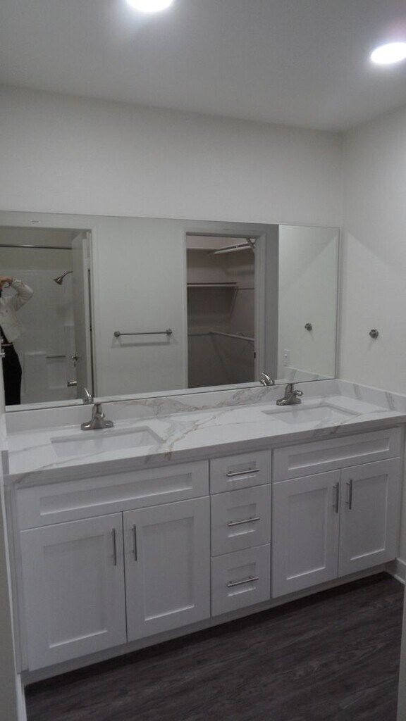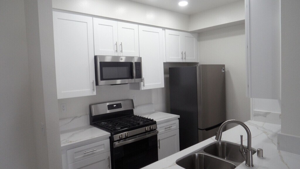 Remodeled, ground level, 1 bedroom, 1 bath condo located in the desirable gated Lakeside community. Unit comes with 2 assigned carport spaces. Unit features fresh paint, new vinyl plank flooring and baseboards throughout, and central air conditioning. Remodeled kitchen with quartz countertops, breakfast bar, all new Shaker style soft-close cabinets and drawers, canned lighting, gas range, dishwasher, microwave, refrigerator. Eating area just off the kitchen. Living room with cozy fireplace and oversized sliding glass door opens to patio overlooking beautiful landscaping and creek. Patio has outdoor closet with washer and dryer hook-ups. Bedroom with plenty of room for a queen-size mattress and walk-in closet. Bathroom has a brand new double sink vanity, canned lighting, and a shower/tub combo. Community boasts two pools and spas. Water and trash included in rent.