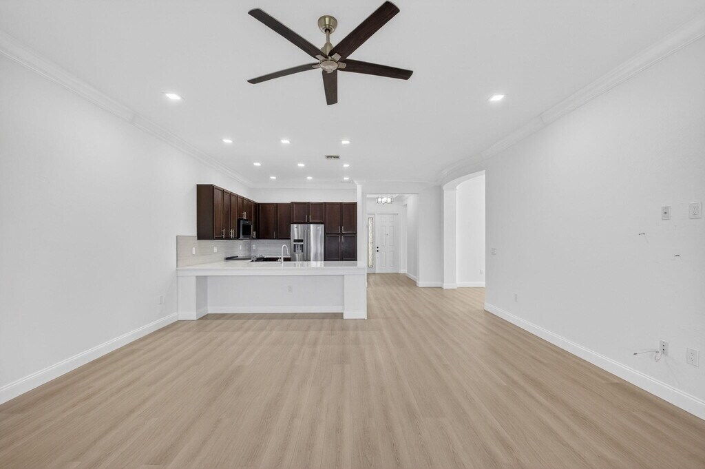 This beautiful 3-bedroom ranch home offers breathtaking long lake views and a host of impressive features. The freshly painted exterior is complemented by accordion shutters,while a whole-home generator with an automatic transfer switch adds peace of mind. Inside,vaulted ceilings with crown molding create a welcoming atmosphere. The updated kitchen features 42'' wood cabinets with under-cabinet lighting,granite countertops with a large breakfast bar,and newer stainless steel appliances. The separate dining room is perfect for hosting dinner parties.The spacious family room opens to a screened and covered patio,overlooking a fenced yard and stunning lake views,ideal for enjoying tranquil sunrises. The primary bedroom includes two walk-in closets and a luxurious bath. Additional highli MLS ID B26001272