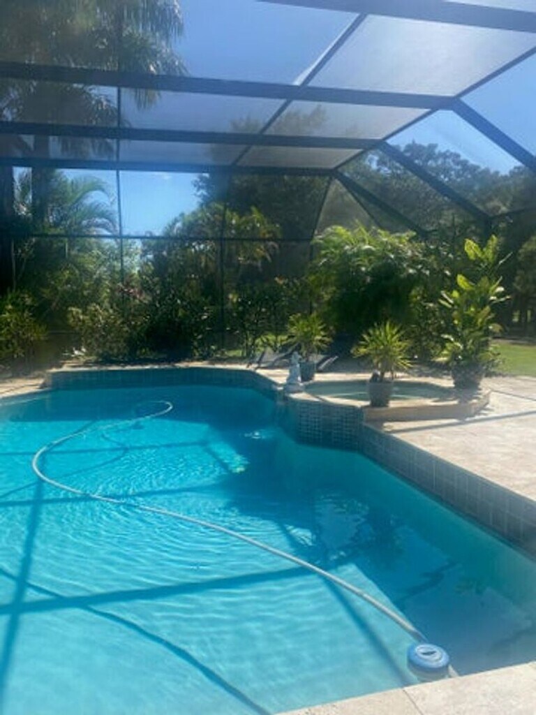 Courtesy of Apogee Real Estate Services Inc Posted by Andrew Coleman with EXP Realty . This beautiful, fully furnished home, newly renovated boasts an open living and entertaining concept. This home features a two car garage with golf cart parking. 3 Bedrooms and 4.5 baths, office, and dine-in kitchen. The stunning vaulted, wood ceiling enhances the living and dining room. The elongated granite entertaining bar is very inviting for parties and gatherings. The huge panoramic screen pool area has 2400 sf that offers a Zen-like feel. The pool and spa are inviting and the surrounding foliage offers privacy. Boca Woods Country Club is prestigious, yet relaxed private golf and country club community.