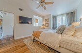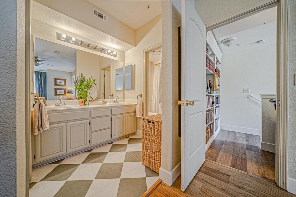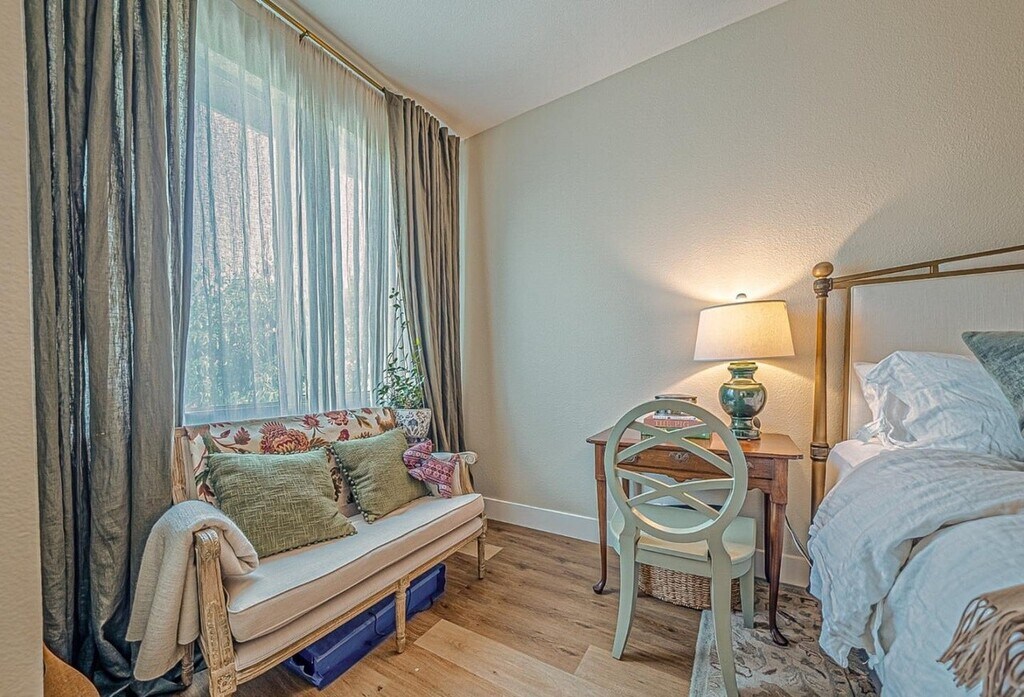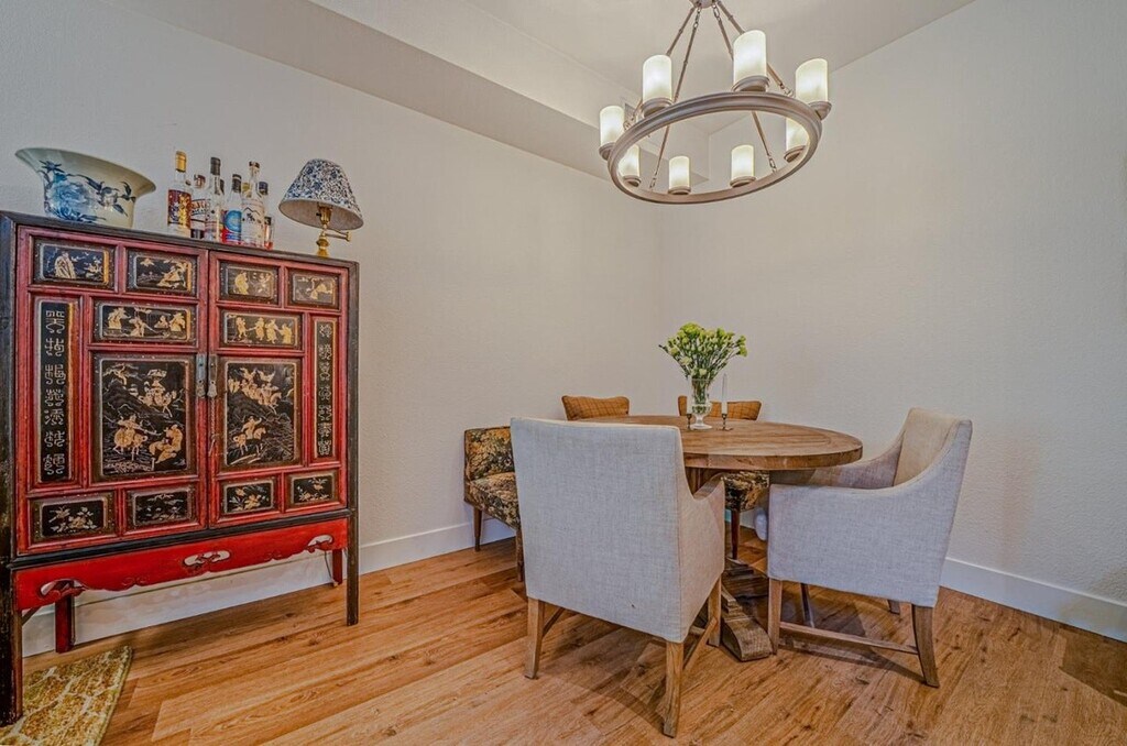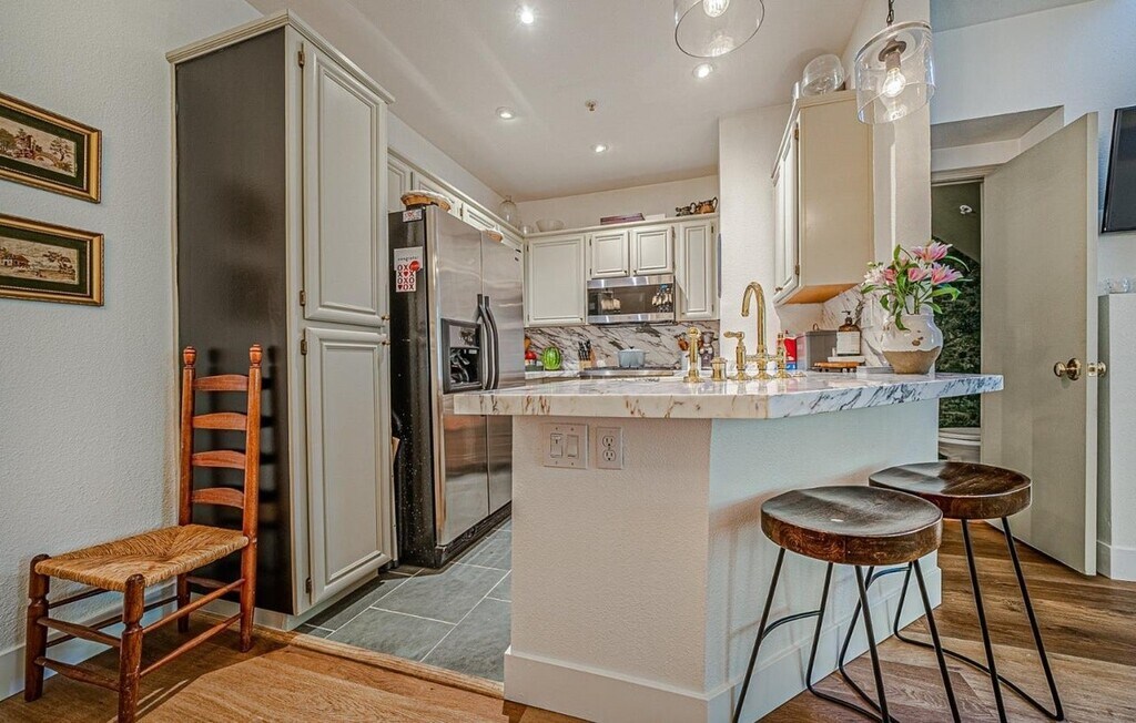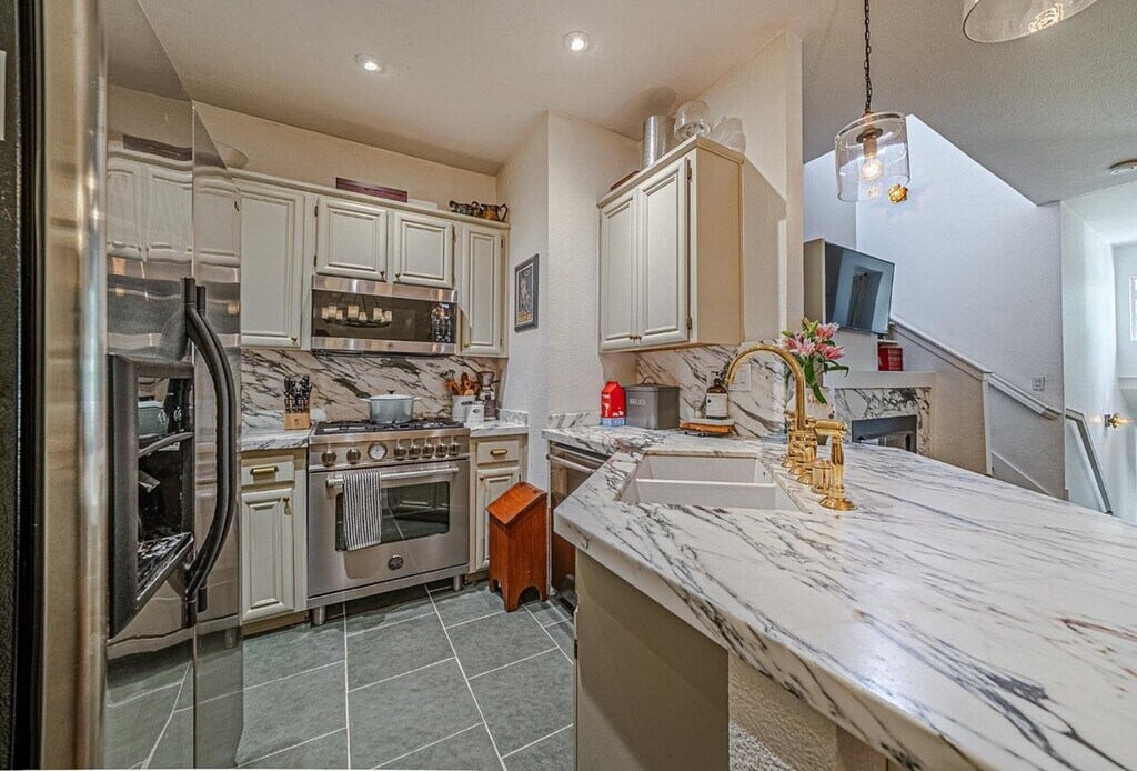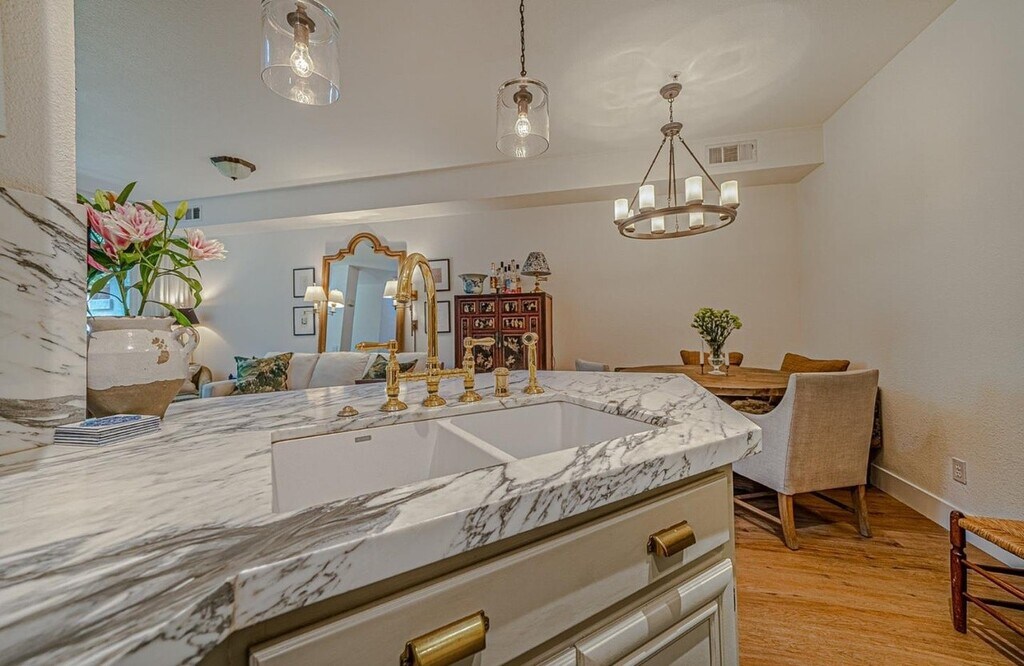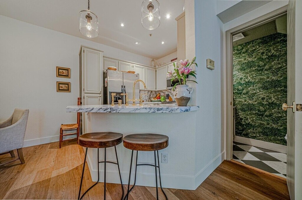 This remodeled gem features high ceilings and western-facing windows offering an abundance of natural light that highlights British Farrow & Ball paint and a luxurious combination of marble and limestone tile throughout. A fully remodeled kitchen is anchored by Arabescato marble countertops, a House of Rohl brass faucet, Restoration Hardware pendants, and a premium stainless steel Italian Bertazonni range. The open floor plan joins a balcony that rests below a canopy of trees and a guest powder room wrapped in designer GP & J Baker wallpaper. The upstairs suite features handmade Spanish tile surrounding a soaking tub, marble floors, and a custom walk-in closet. The attached tandem garage also includes a bonus office space. Minutes from 85 & 101, and light rail, the home is close enough to experience the vibrant city, yet far enough to feel the seclusion of the natural wonderland that exclusively surrounds the Jubilee community.