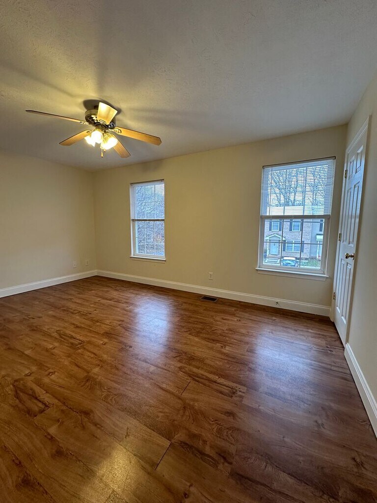 Master bedroom upstairs has attached bathroom. Additional full bathroom upstairs for spare bedroom. Living room on the front side of the townhome. Half bath, kitchen and dining on the backside. nice private patio out back with small attached storage shed. Washer/dryer is provided. No pets allowed. features electric heat pump and central a/c minimum of one year lease Tenant responsible for lawn care
