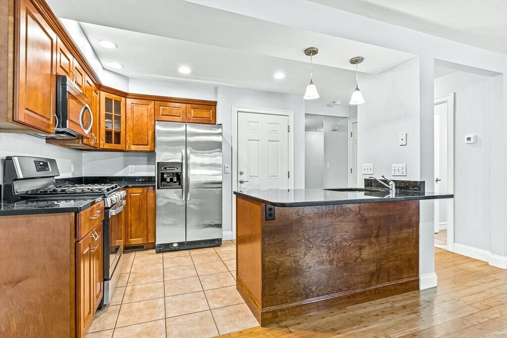 Newer construction! 7 room townhouse! Granite and stainless kitchen with Cherry finish cabinets. Open floor plan to the living area with gas fireplace. Hardwood eco-friendly floors throughout. Finished basement has family room/4th bedroom/Home office option,& another full bath,wet bar and wine fridge for your own private retreat. Features include 1st floor bath and 2nd floor laundry hook ups,heated 1 car garage,4 baths,high efficiency boiler. Primary bedroom equipped with huge walk in closet and separate bath. Massive shared backyard with patio area for grills. Steps from Reading Center's shopping and transportation lines. Don't miss out. MLS# 73474977