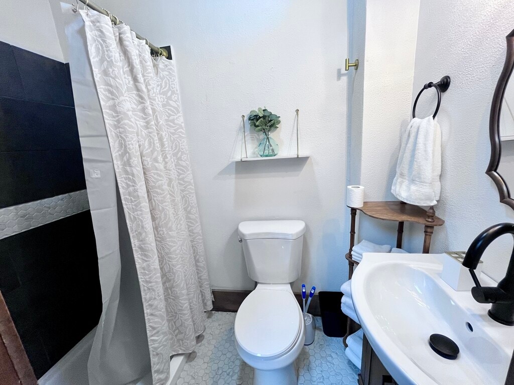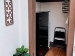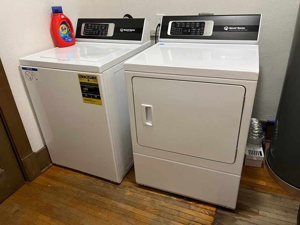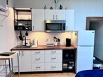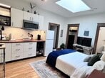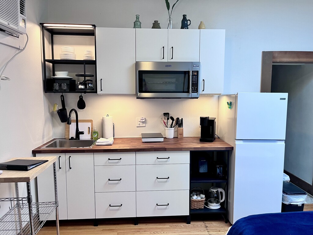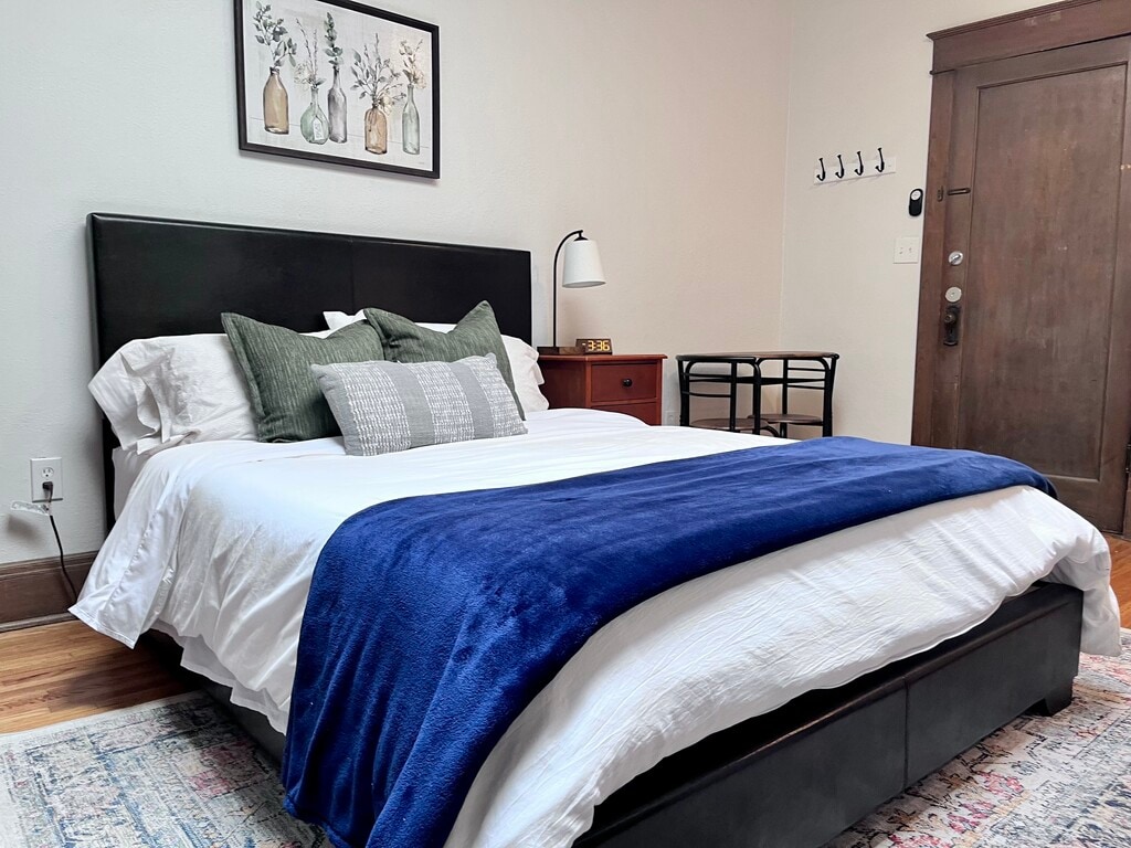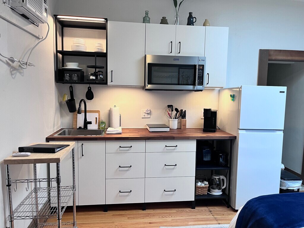 Right on the square of downtown Kirksville, this studio apartment has all you might need in one room. Queen bed, small kitchen, plenty of storage in two closets, and a brand new bathroom with walk-in shower. The kitchenette has a spacious sink, large convection-capable microwave, and a portable induction burner with induction pots and pans. Washer and dryer accessible from hallway just next to unit.