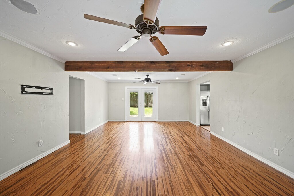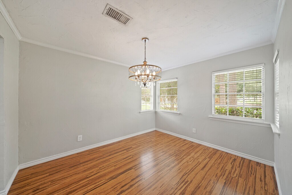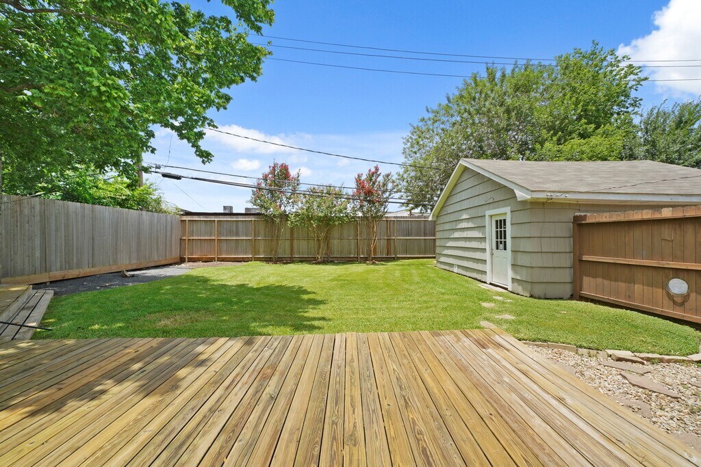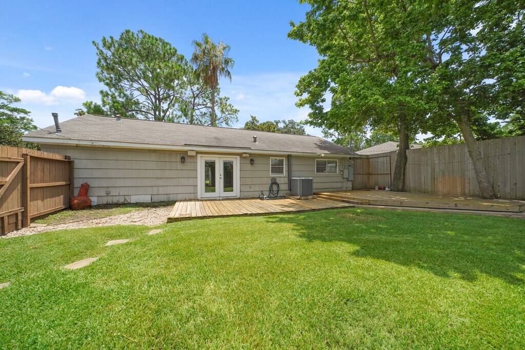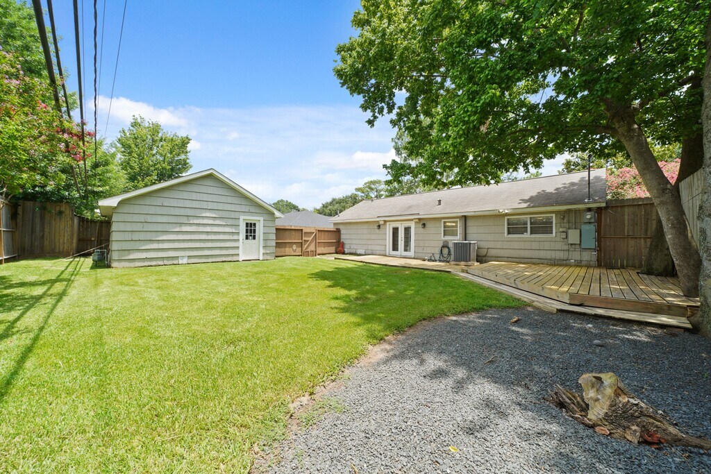 Nestled among beautiful tall pine trees sits this charming one story home with quick access to major freeways and local shopping and dining. The covered front porch welcomes you into the home with hardwood floors,crown molding,recessed lighting and opens into the family room featuring a wood beamed ceiling,built-in speakers,TV mount,ceiling fans,and French doors that open to both the front porch and the spacious backyard. Formal dining room opens to the kitchen which includes cabinets with ceramic tile back splash,ceramic tile flooring,pantry with barn doors,S/S appliances including a 5-burner gas range and refrigerator,washer & dryer stay. Owner’s suite has a walk-in closet and a private bath w/a marble-topped vanity and subway-tiled shower. Two secondary bedrooms have access to a second full bath. Beautiful backyard includes mature trees,crêpe myrtles,a 38x22 deck which is great for entertaining family and friends and a step stone walkway to a detached two-car garage. MLS# 7976646