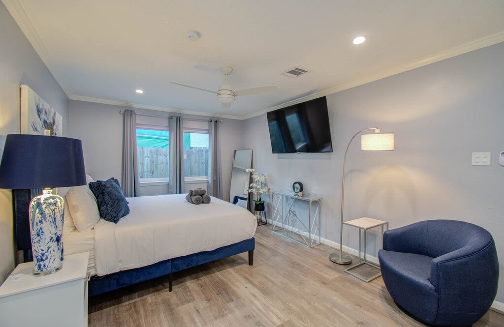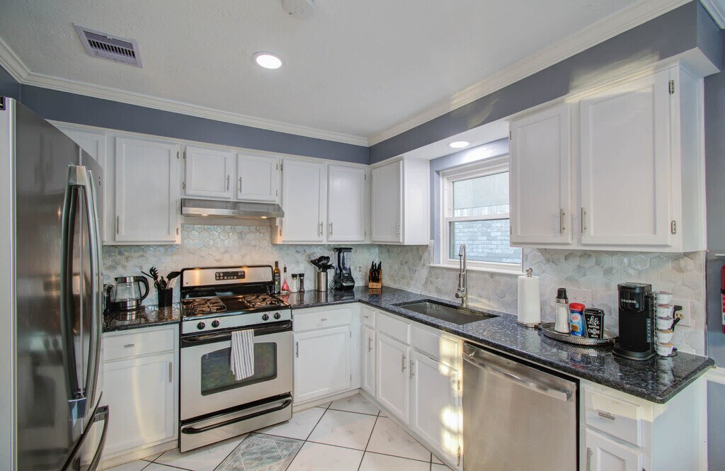 Nestled on a quiet tree-lined street in Houston, this spacious 4-bedroom home offers a serene escape with a beautiful layout perfect for accommodating large groups. Feel at home with its timeless style and meticulous attention to detail. The property features an outdoor swimming pool and a covered patio, making it an ideal retreat for relaxation and entertainment. This lovely vacation retreat strikes the perfect balance between an escape from daily life and the cozy comforts of home. Thoughtfully furnished, the home boasts a stunning white kitchen, 4 beautifully furnished bedrooms, and a backyard that invites hours of enjoyment. Catering to both short-term and medium-term stays, it serves as an excellent choice for corporate housing needs, providing a welcoming "home away from home" experience. The fully equipped kitchen includes stainless steel appliances and basic cooking essentials, while the dining area features a classic wooden table with plush seating for six. Free parking is available in the two-car garage or on the driveway. We welcome house-trained pets with a non-refundable pet fee of $150 per pet, with a maximum of two pets per stay. An additional nightly rate applies for more than six guests, with a $29/night fee for each extra guest. Welcome to Houston, a city known for its tasty Tex-Mex and contributions to space and science, all wrapped in southern charm. While here, explore the vibrant culinary scene and nearby attractions such as the Lone Star Flight Museum, Almeda Mall, and the Houston Museum of Natural Science, all within a short drive. Exciting neighborhoods like Midtown and Montrose offer great restaurants and lively bars, ensuring there's always something to do. Smoking is not allowed, and violations are subject to a $450 fine plus cleaning and repair costs. Check-in is at 4 pm and check-out is at 10 am. No parties or large gatherings are allowed, and only registered guests are permitted on the property. A noise alert device is installed to monitor decibel levels, ensuring compliance with local noise ordinances. The fireplace is currently inoperable, and while body towels are provided, guests are encouraged to bring their own pool towels. The home is equipped with high-speed Wi-Fi, making it remote work-friendly. A laptop computer is not included. [SI]
