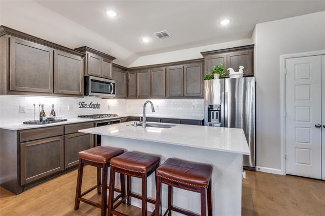 Beautifully appointed 2021 Trophy Signature Home is nestled in the coveted Ventana subdivision and offers a thoughtfully designed open-concept floorplan. This 3-bedroom, 2-bath home also features a private office with French doors—perfect for working from home or a quiet retreat. The heart of the home showcases a spacious living area with a cozy fireplace, flowing seamlessly into the kitchen complete with a large island, granite countertops, gas stovetop, and ample cabinetry—ideal for both everyday living and entertaining. The separate primary suite provides privacy and comfort with double sinks, generous counter space, and a relaxing ensuite layout. Additional highlights include a separate utility room, security system, tankless water heater, underground utilities, and a 2-car garage. Step outside to your private, wood-fenced backyard oasis featuring a covered patio, and charming twinkle lights—perfect for evening gatherings or unwinding outdoors. Ventana offers resort-style amenities including swimming pools, playgrounds, parks, greenbelts, and miles of walking, jogging, and bike trails. Located within an excellent Fort Worth school system with Benbrook Middle and High School, this home combines modern comfort, community living, and an unbeatable location.