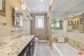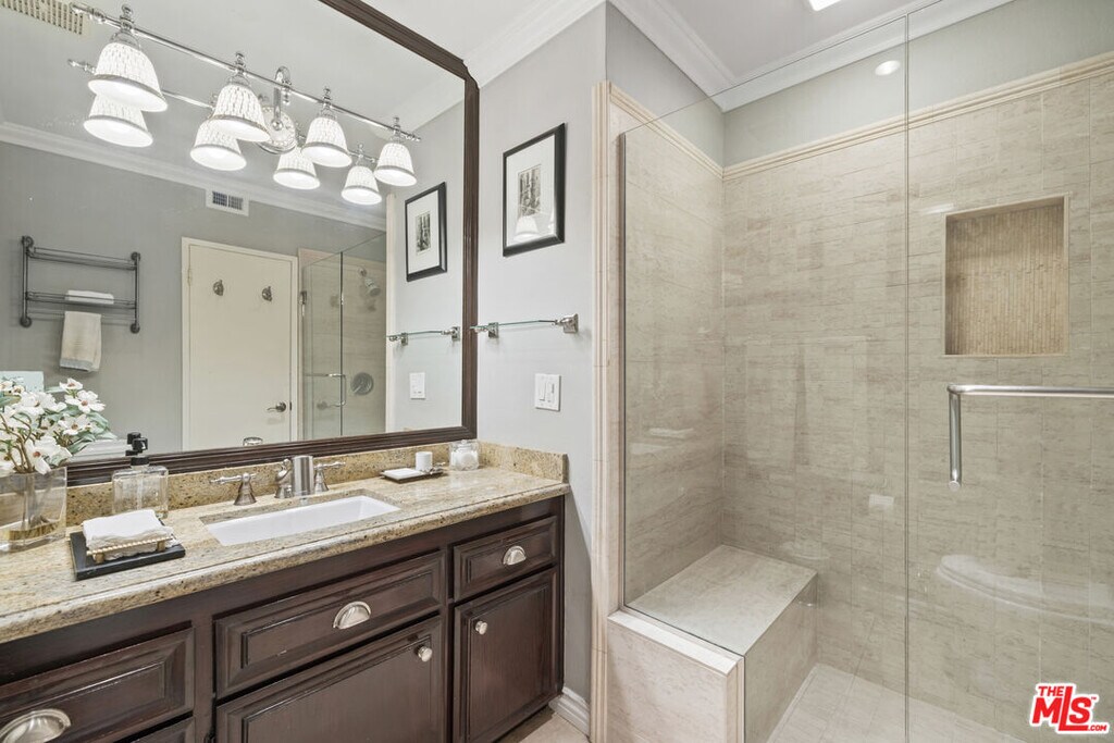 Owner's unit exquisitely and tastefully, totally remodeled, elegant two bedroom & den, rear corner, penthouse on Wilshire Corridor. All high quality fixtures and furnishings. Gourmet kitchen with granite counters and top of the line stainless steel appliances including washer/dryer, refrigerator, wine cooler, range, microwave, dishwasher. Recessed lighting throughout. Hardwood and tile flooring. Plantation shutters. Central heat & air. Large open dining area/living room. Master bathroom with separate tub & shower. Den with fireplace. Fully designer furnished complete with all kitchen dinnerware, serveware, glassware etc. Security building with security cameras. Close to restaurants, shopping, movies, UCLA and much more. You really do need to just bring your clothes and toothbrush. MLS# 26642969