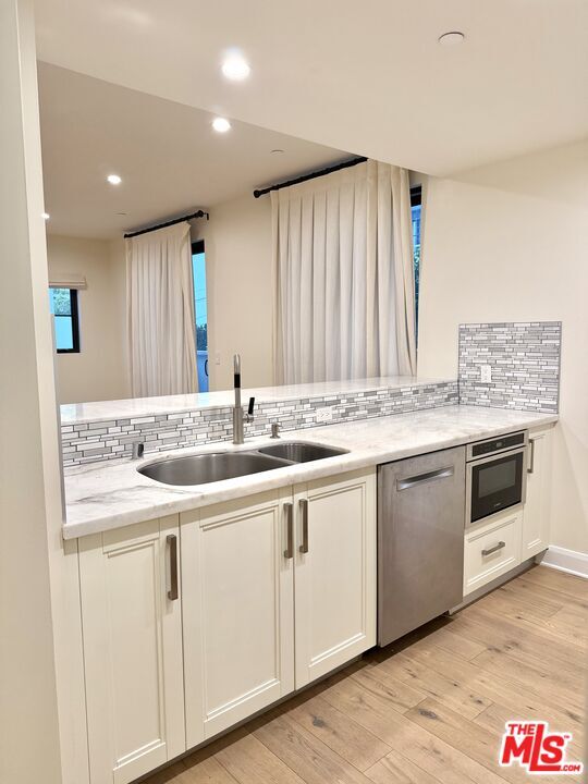 Modern condo on desirable, tree-lined Ashton Avenue in the heart of West LA. This open home features high ceilings, hardwood floors, recessed LED lighting, and a gas fireplace perfect for entertaining. The designer kitchen showcases Italian-style cabinetry, marble countertops, a Bertazzoni gas range, Bosch stainless steel appliances, and a breakfast bar opening to the dining area. The spacious primary suite offers an exceptional walk-in closet and a spa-like bath with double vanity, oversized shower, and soaking tub. A generously sized second bedroom is paired with a full bath. Enjoy a private balcony off the living and dining spaces. Two secured subterranean parking spaces plus storage included. Prime Westside location surrounded by multi-million-dollar homes, with only single-family residences across the street. MLS# 26653079