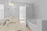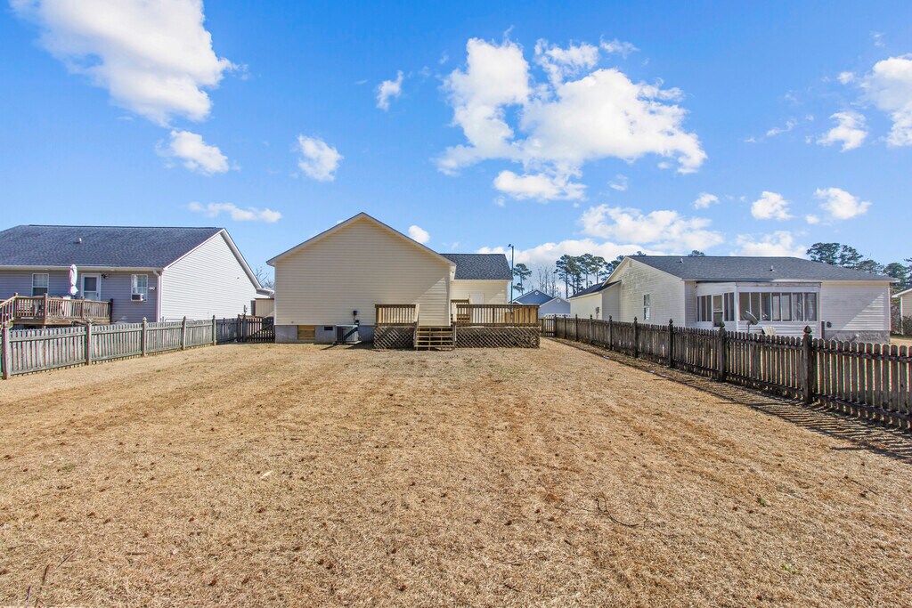 This well-maintained 3-bedroom, 2-bath home is located in a quiet neighborhood with easy access to MCAS Cherry Point and New Bern. Recently refreshed with new flooring throughout, the home offers a comfortable and functional layout. The spacious kitchen features ample cabinet space, making it ideal for everyday living and meal prep. The primary bedroom includes a private ensuite with a soaking tub, walk-in shower, and double-sink vanity. Two additional bedrooms offer comfortable space and are served by a full hallway bathroom. Enjoy the outdoors with a newly built back deck and a fenced backyard—perfect for relaxing or entertaining. Additional features include a single-car garage and generously sized rooms throughout. A great opportunity for those seeking a peaceful setting with convenient access to major routes and nearby amenities.
