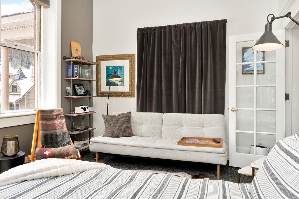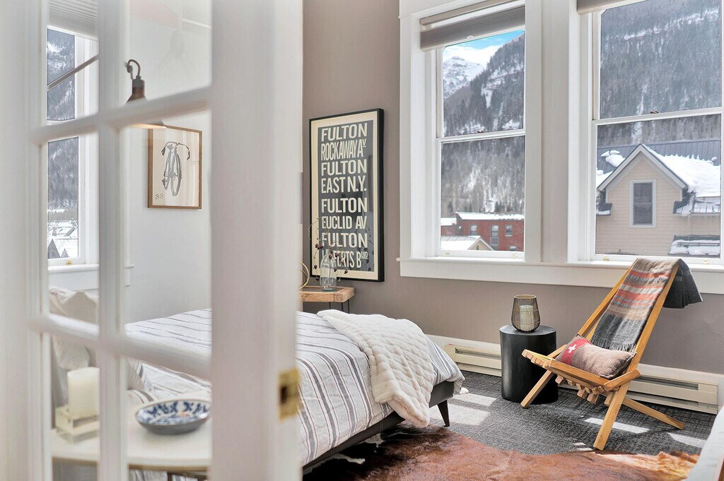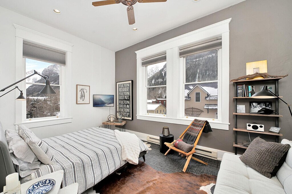 Step into Telluride history at Miner’s Union 7, a light-filled downtown condo with a musical past. Once home to the original KOTO Radio Station where Jimmy Buffett recorded, and originally built in 1902 as the Miner’s Union Hospital, this 1-bedroom retreat offers both heritage and modern comfort. Feel at home with soaring 10-foot ceilings and 6-foot windows that flood the space with natural light and frame unobstructed views of Ajax and Ballard Peaks. Thoughtful touches ensure a cozy yet upscale stay, from stainless steel appliances (no dishwasher) and multiple coffee makers (Nespresso, Keurig, and drip) to luxury bath amenities. The condo also features internet-ready TVs with streaming apps, a Bluetooth speaker, professionally cleaned linens, and a shower/tub combo with pedestal sink and hairdryer provided. A street parking permit is included. Shared coin-op laundry is available (detergent and dryer sheets provided). Located just one block from Main Street, you’ll enjoy quick access to restaurants, shops, the gondola, and the best of downtown Telluride. Enjoy views of Telluride Ski Resort, Bear Creek Valley, Ajax and Ballard Peaks. Miner's Union 7 is equipped with a 10-gallon hot water tank, ideal for quick showers and everyday use. To ensure hot water availability for all guests, using a moderate water flow and being mindful of shower length is recommended. Extended high-volume use may temporarily deplete the hot water supply while the tank reheats. No pets and no smoking are allowed. Registration Number: 19078 [SI]