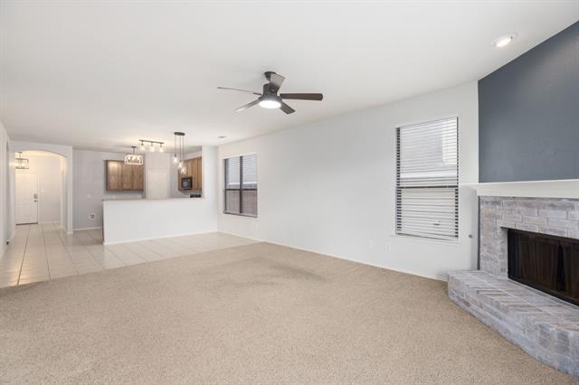 Impeccable one-story home featuring charming arched pass-throughs and stylish updated light fixtures with ceiling fans throughout the open-concept design. The foyer includes an art ledge, perfect for showcasing your favorite décor. A cozy brick fireplace anchors the spacious living room, which also offers easy access to the backyard patio. The kitchen is designed for both function and style, complete with a breakfast bar, sleek black appliances, and a corner walk-in pantry, seamlessly connecting to the dining area. Wood-look tile flooring adds a modern touch to the bathrooms. The primary suite includes a frosted window over the garden tub, separate shower, dual vanity, and a large walk-in closet. Outdoors, enjoy a patio overlooking the grassy backyard with shade trees—ideal for play or relaxation. Located within walking distance to the community pool, basketball courts, and playground. Pets considered on a case-by-case basis (40lb weight limit).