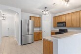 Impeccably maintained one-story home with an inviting open-concept layout, arched pass-throughs, and updated light fixtures and ceiling fan kits throughout. The foyer welcomes you with a charming art ledge ready for your favorite seasonal decor or personal touches. A cozy brick fireplace anchors the spacious living area, while patio access makes indoor-outdoor living easy. The kitchen is designed for both function and flow, featuring a breakfast bar, kitchen refrigerator, and a corner walk-in pantry, all opening seamlessly to the dining area. Wood-look tile adds durability and style in the bathrooms. The private primary suite offers a relaxing retreat with a garden tub framed by a frosted window, separate shower, double vanity, and a large walk-in closet. Step outside and enjoy spring-like evenings on the patio overlooking a generously sized grassy backyard with mature shade trees and room to play, entertain, or unwind. Ideally located within walking distance to the community pool, basketball courts, and playground. Pets are case by case. 40lb weight limit.