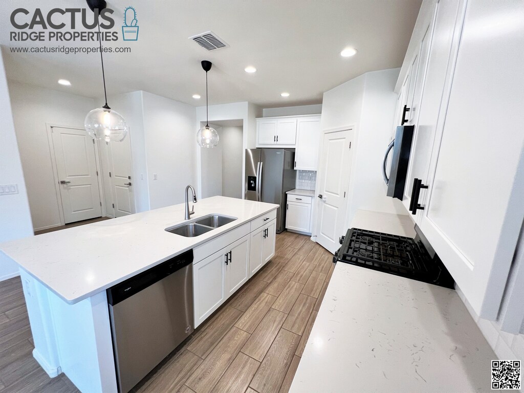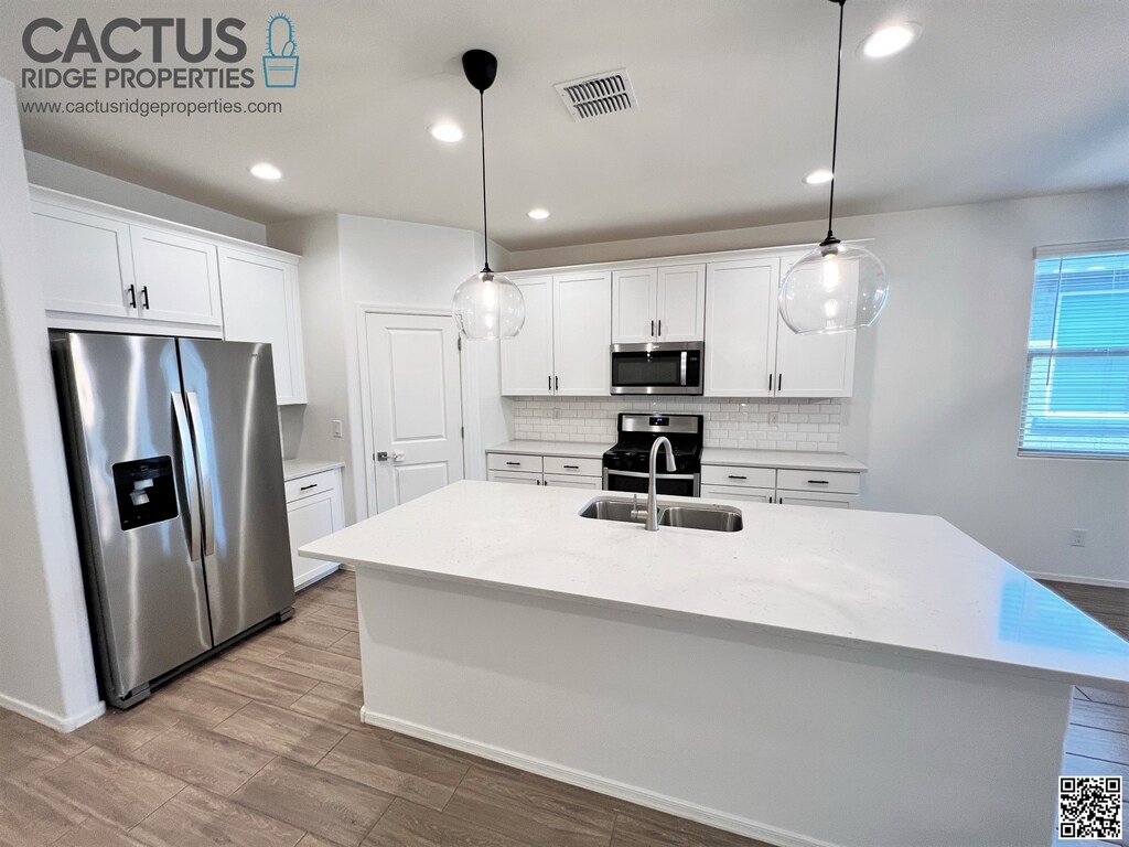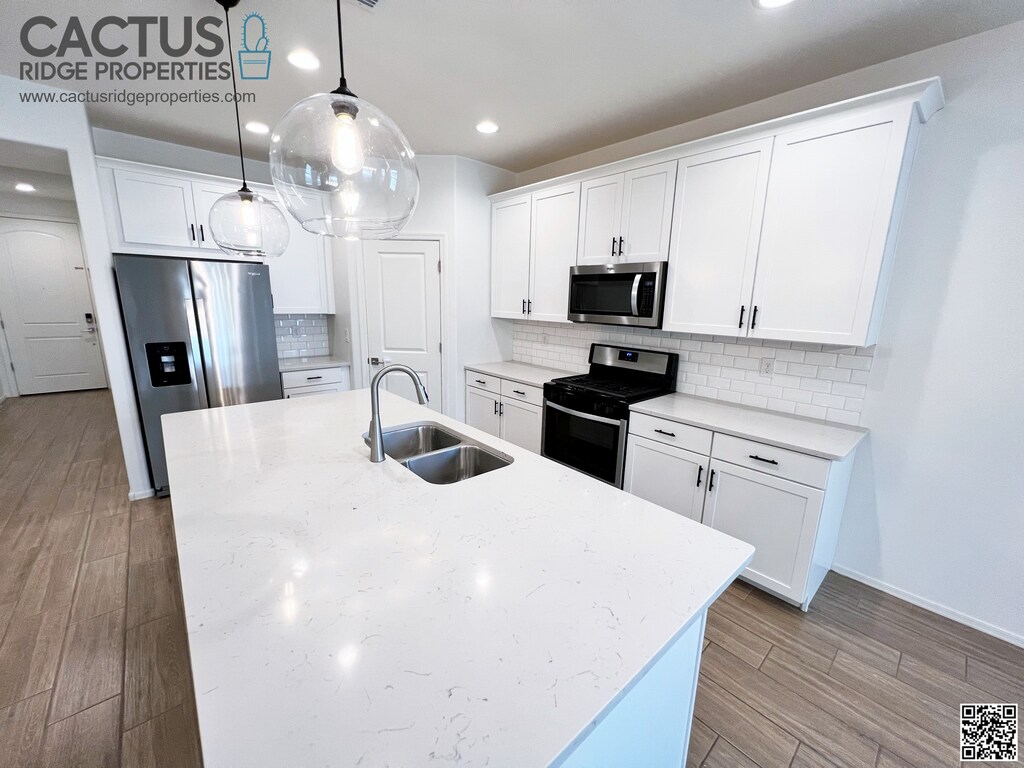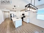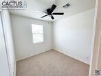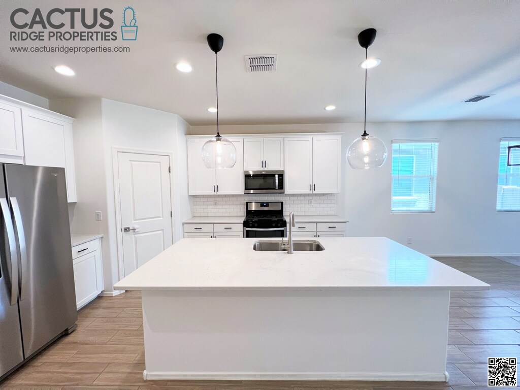 Welcome to this stunning 4-bedroom, 3-bathroom, 1-bonus room home in Gladden Farms, Marana, Arizona. Available from Feb. 14, 2025, it features modern upgrades such as wood-look plank ceramic tiles and a beautiful kitchen with stainless steel appliances, quartz countertops, upgraded fixtures, and shaker cabinets. The added bonus room offers versatility, and there's a bedroom with an en-suite bath. The master suite includes double vanities, a walk-in shower, and a spacious closet. A washer and dryer are included with the home. The landscaped backyard has a covered patio and artificial turf. This energy-efficient home has spray foam insulation to save you money on utilities. If you have young kids, they can attend the excellent and recently constructed Tangerine Farms K-8 School. A brand new Fry’s shopping center within 2 minutes of the home was also recently opened! Rent is $2,150 per month, with a minimum 1-year lease and a $3,225 security deposit. Dogs are considered, subject to owners' approval. $300 pet fee and $50 added monthly per pet. Non-smoking property. Applicants need a good credit score and a verifiable gross income of 3 times the rental rate. $55 application fee per person over 18 is required to perform credit checks, background checks, etc. Don’t miss this well-appointed house you’ll be proud to call your home and show your family! Visit cactusridgeproperties dot com to apply and see more information on the house and neighborhood.
