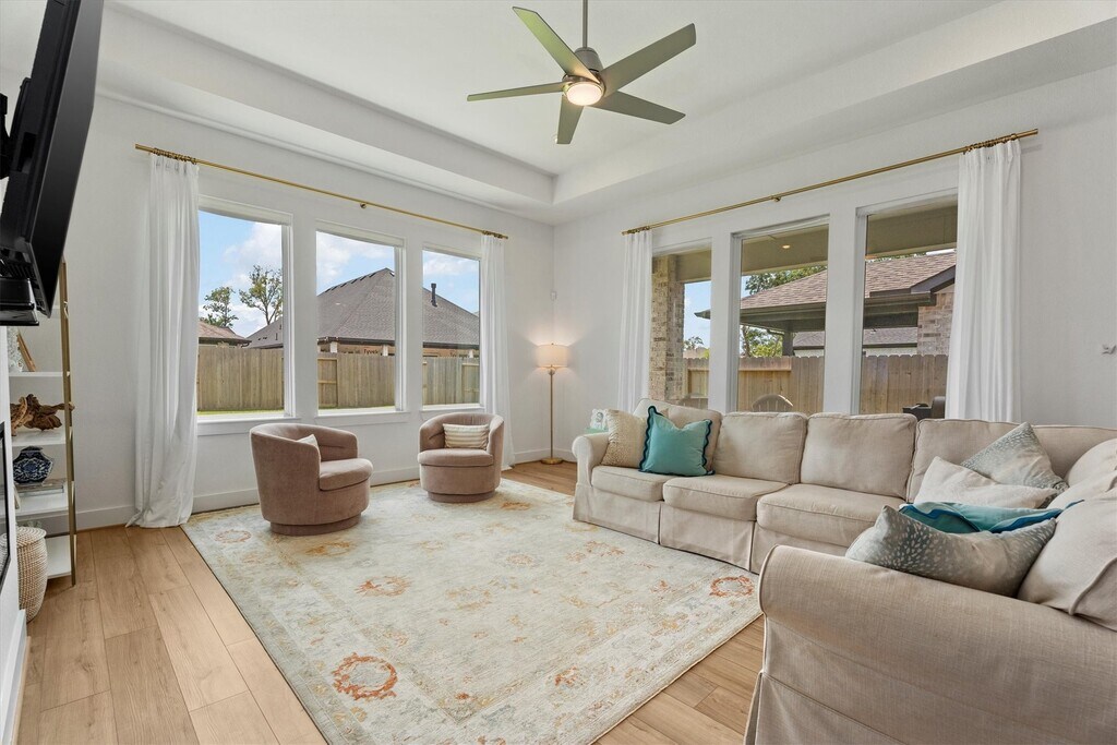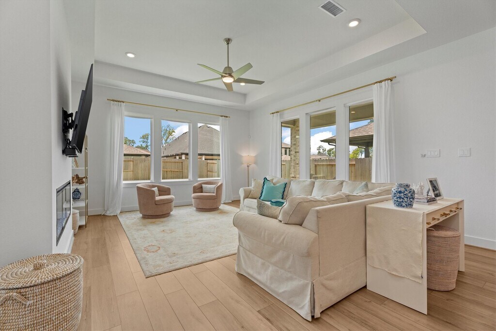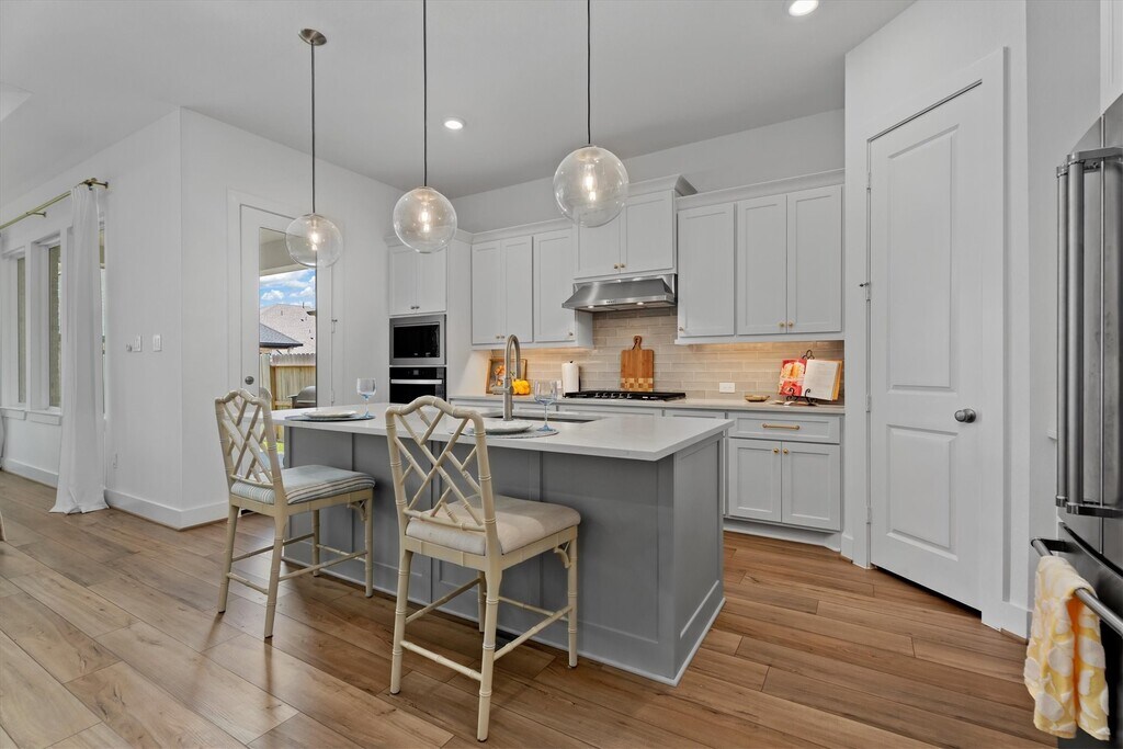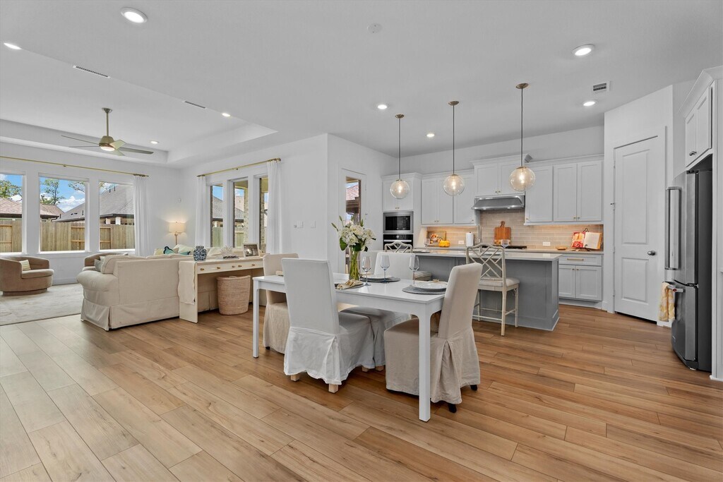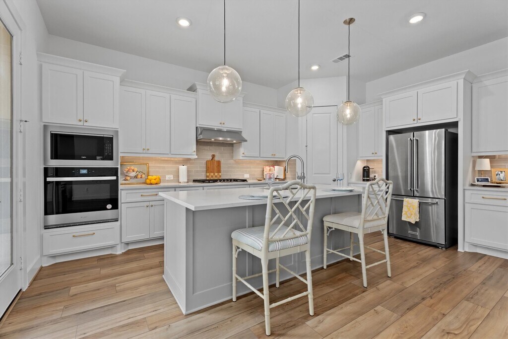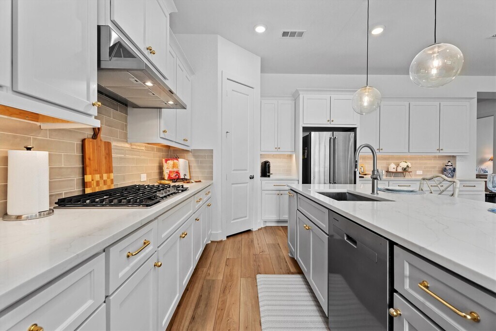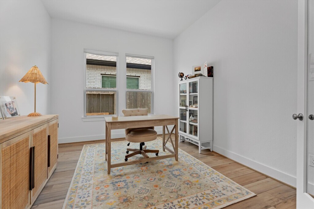 Stunning 1 story brick home that has been meticulously maintained residence features 4 beds,3 full baths,and a dedicated home office. Elegant high tray ceilings and Shaw Polaris Plus Driftwood luxury vinyl plank flooring flow seamlessly throughout the home. Kitchen is a delight with a gas cooktop,stainless steel appliances,quartz countertops,and Rejuvenation hardware,which is also featured in all 3 baths. Open concept design connects the kitchen to the dining area and living room,where large windows fill the space with natural light. Spacious primary suite has a spa like ensuite with double sinks,soaking tub,separate shower,and a walk in closet. Curtain hardware and curtains (excluding the office) remain with the home,along with the refrigerator and dryer. Step outside to a covered patio pre plumbed for gas and water,perfect for outdoor entertaining. Enjoy Sienna’s exceptional amenities,including pools,scenic trails,playgrounds,volleyball courts,and more. MLS# 42218903