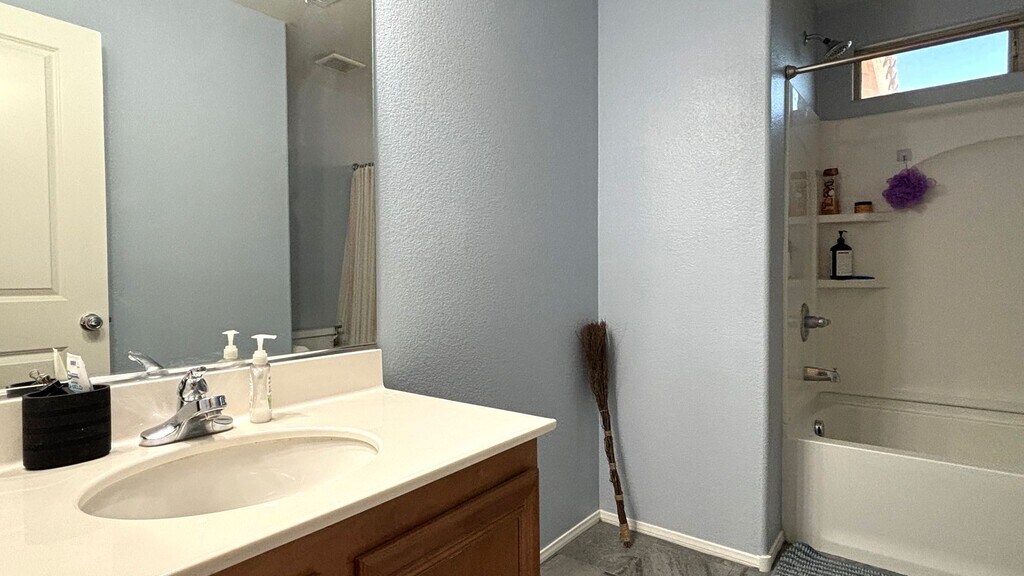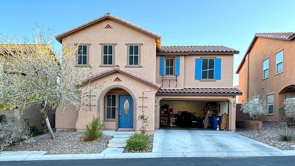 Two-story home with a 2-car garage located in Providence near Sky Canyon in Las Vegas, NV. This 3-bedroom, 3.5-bath home features an open-concept kitchen with abundant cabinet space, a large island for meal prep, stainless steel appliances, and room for a dining table. The front living room overlooks both the kitchen and backyard, creating a bright, connected space. Tile flooring covers the downstairs, while the stairs, hallway, and bedrooms are carpeted. The primary bedroom is spacious with backyard views. The primary bathroom features a separate layout for added comfort and privacy. tub and shower.