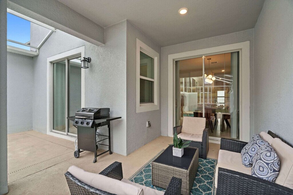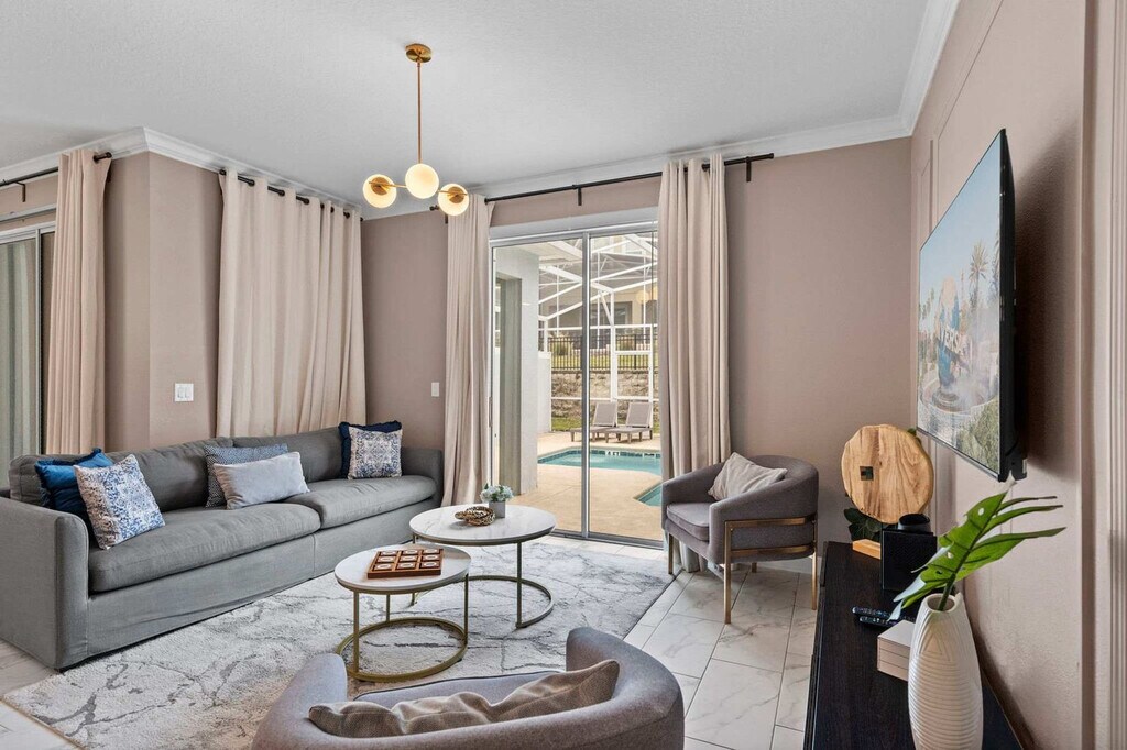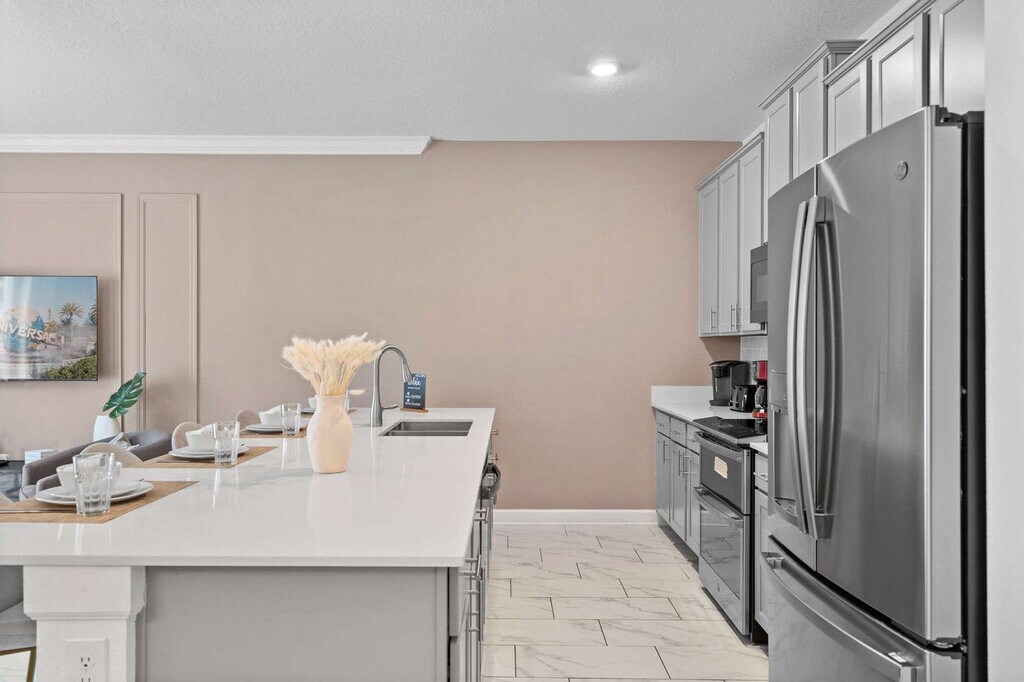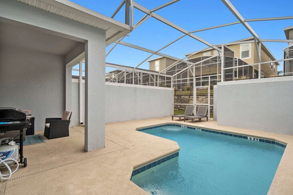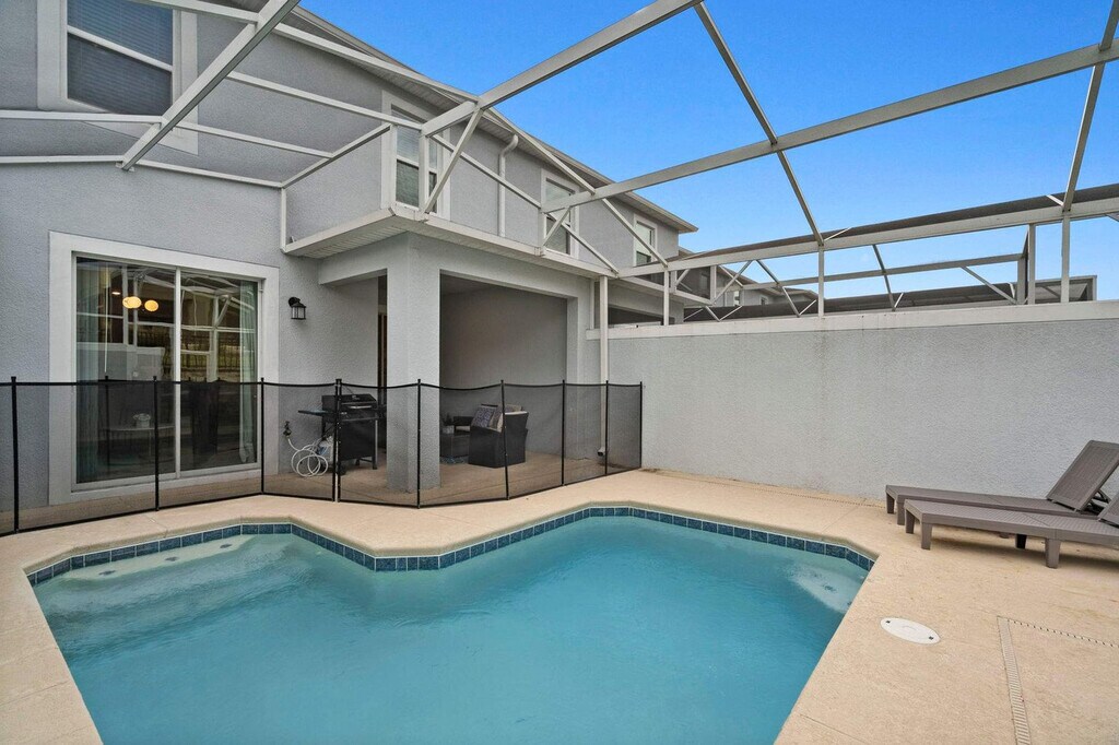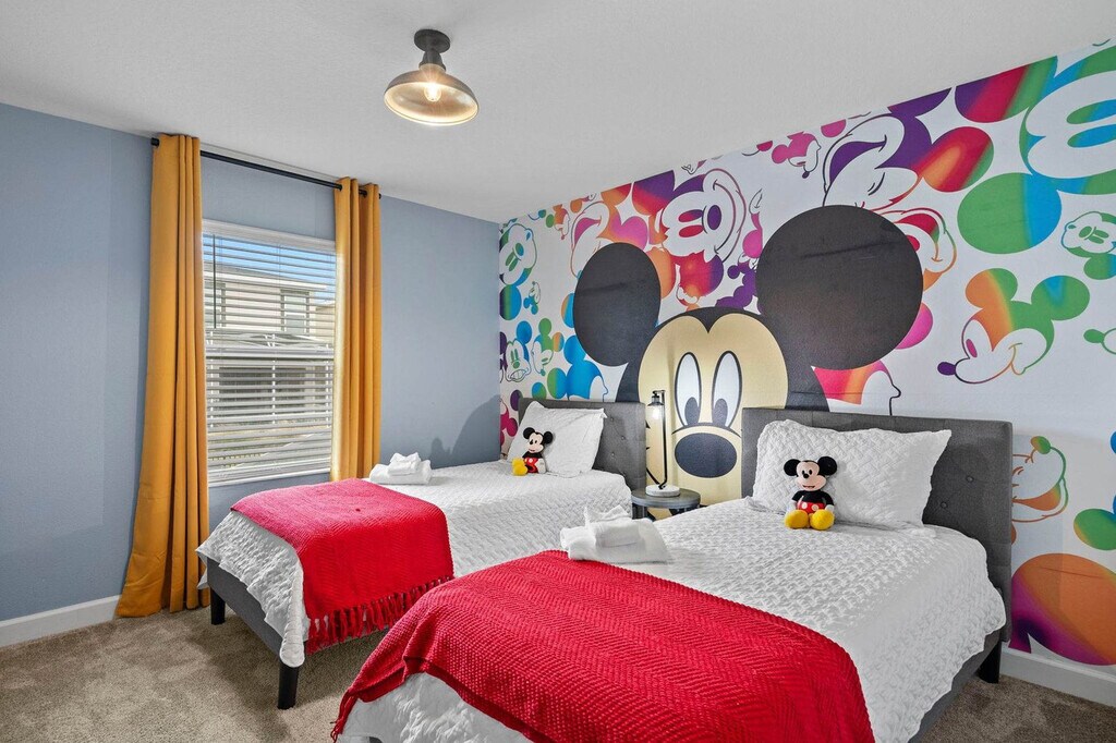 Escape to this beautifully decorated 4-bedroom, 3-bathroom townhome, designed to host up to 10 guests. This inviting retreat features two adorable themed bedrooms – a Mickey Mouse room and a Tangled-inspired room – perfect for creating magical memories. Unwind in your private pool or enjoy the outstanding amenities at Champions Gate Resort, including multiple pools, a lazy river, tennis courts, mini-golf, and more. Ideally situated near markets, restaurants, and shops, this Orlando/Kissimmee getaway is the ultimate destination for families and the perfect vacation sanctuary. Step into a home that exudes charm and coziness! This lovely 4-bedroom, 3-bathroom townhome has been thoughtfully designed with modern, inviting decor, creating the perfect space for your family getaway. The open-concept living, dining, and fully equipped kitchen areas are the heart of the home, ideal for relaxation and shared meals. Outside, unwind in your private heatable pool on the patio, a serene retreat for peaceful moments. On the first floor, a beautifully decorated King bedroom with a nearby bathroom offers easy access. Upstairs, discover the elegant master King suite and two adorable themed bedrooms: a Tangled-inspired room with a double-bunk bed with two double beds and a Mickey Mouse room featuring two twin beds that are perfect for kids and kids at heart. Enjoy added convenience with a fully equipped laundry room, complimentary WiFi, free parking, and a welcome kit stocked with essential bathroom and kitchen items to make your stay seamless. Craft unforgettable memories in this adorable retreat, where comfort and charm blend perfectly. Your magical vacation awaits! Pool heating is available for an additional fee and there is a charge for using the barbecue grill. Champions Gate Resort is a resort-style community that offers every imaginable amenity for a blissful stay. It features an impressive clubhouse with a variety of courts and outdoor activities like tennis, beach volleyball, and a golf course, while its restaurant and fitness center will help you stay refreshed and fit. Its swimming pool complex is perfect for a splashy day, with slides, a lazy river, and a kids splash pool. Plus, the resort is just 20 minutes away from Disney Parks, ensuring plenty of opportunities for fun and adventure. Shopping, dining, and entertainment are also within reach, with stores, restaurants, and supermarkets nearby. It's the perfect place for a family getaway; come and experience all the perks of Champions Gate Resort! Guests are responsible for replenishing bathroom and kitchen amenities. Quiet hours are between 22:00 and 8:00. [SI]