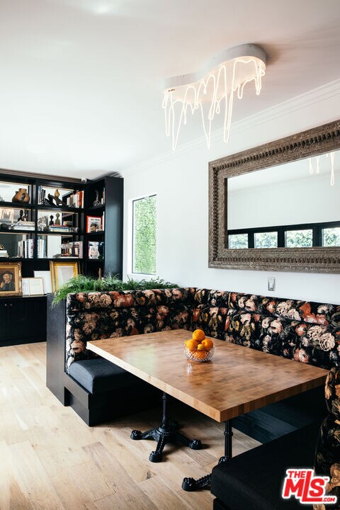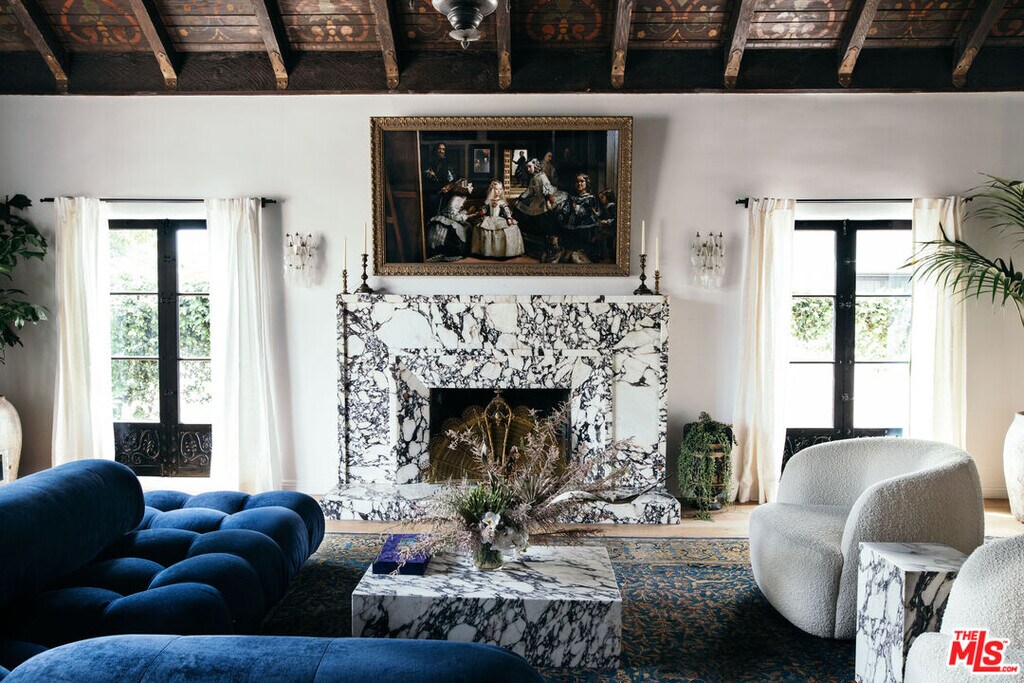 Nestled on a picturesque street in Little Holmby, 10749 Weyburn Avenue is a beautifully restored 1930s Spanish home that honors its original architecture while offering modern-day comfort. Reimagined in 2020 by interior designer Kevin Klein, this 5-bedroom, 6-bathroom residence spans 4,259 square feet and showcases artisan craftsmanship throughout. Authentic details -- original ironwork, stained glass, and intricately stenciled and carved wood beams -- are woven seamlessly throughout the home, lending warmth and character. A gracious formal entry opens to a dramatic living room with soaring beamed ceilings and French doors that lead to an outdoor patio. A stunning stone fireplace and built-in wet bar create an inviting space for entertaining or everyday living. Just beyond, find a fully modernized kitchen with premium appliances, opening to a sunlit family room and an informal dining nook with banquet seating. A separate formal dining room, featuring checkered tile floors and a striking coffered ceiling, provides an intimate setting for gatherings. Completing the first floor are a powder room, a versatile den or office, and a private bedroom suite. Upstairs, a charming library loft accented by an original stained glass window leads to four additional bedroom suites, including the spacious primary. The primary suite impresses with ample closet space and a luxurious en suite bath with dual vanities, a steam shower, and a built-in glass-enclosed sauna. Secured behind gates and secluded by mature hedging, the property provides exceptional privacy. The landscaped backyard features an expansive tiled patio, built-in outdoor kitchen, and turf lawn, the ideal space to dine alfresco or relax in the California sunshine. Covered parking is set beneath the original porte cochere, complete with an EV charger. Ideally situated within the Warner Avenue Elementary School bounds, this prime location offers convenient access to Westwood Village, UCLA, acclaimed dining, and is just minutes from Westfield Century City. A rare opportunity to enjoy a timeless Spanish home with modern amenities in one of Los Angeles' most sought-after neighborhoods. MLS# 26643307
