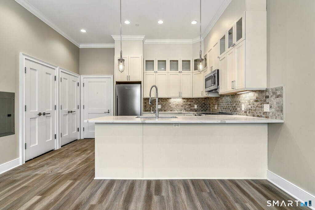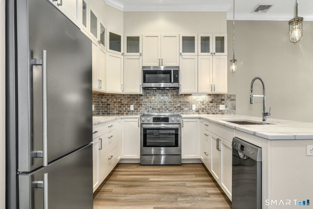 Call for Availability - Welcome to Darien Place, a thoughtfully designed residence built in 2021 that seamlessly blends the character of the original 1928 brick structure with modern living. This 1-bedroom, 1-bath home features 9+ foot ceilings, exposed brick, and an open layout to flood the space with natural light. The kitchen is appointed with Bosch appliances and clean, modern finishes, while the spacious bedroom with ensuite full bath includes a walk-in shower. Additional features include in-unit washer and dryer and privacy window treatments. The building offers controlled access to the lobby, elevator, and stairwell. One reserved parking space and a private storage cage are included. Ideally located in the heart of downtown Darien, with close proximity to restaurants, shopping, train, library, and everyday conveniences. No smoking. Pet restrictions apply; please inquire to learn more. MLS# 24160960
