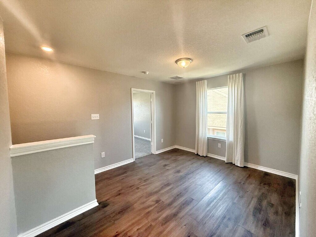 Stunning two-story home in the highly desirable Legend Point subdivision! This beautifully maintained property features numerous upgrades and fantastic curb appeal, highlighted by its charming covered front porch. Step inside to a warm and welcoming entryway offering a convenient half bath, coat closet, and direct access to the two-car garage. The spacious living/dining combo is filled with natural light from multiple windows and includes an electric fireplace-perfect for cozy evenings. The open layout creates an ideal environment for both daily living and entertaining. The kitchen-perfect for cooking and hosting-offers a breakfast bar, granite countertops, stainless steel appliances, and a walk-in pantry. Upstairs, a versatile loft provides the perfect office or flex space and thoughtfully separates the primary suite from the secondary bedrooms, laundry room, and second full bath. Both secondary bedrooms are generously sized with excellent closet space. The shared bathroom features a single vanity with an extended countertop, offering great functionality and extra room, along with a tub/shower combo. The spacious primary bedroom features a ceiling fan and an en-suite bathroom equipped with double vanities, a walk-in shower, separate garden tub, private toilet room, and walk-in closet with built-in shelving. Outside, enjoy a peaceful backyard with no rear neighbors and a patio slab ideal for morning coffee or evening relaxation. Additional features include built-in speakers throughout the downstairs and upstairs hallway-perfect for enjoying music throughout the home. Ideally located within walking distance to the community pool and playground and just minutes from IH-35, shopping, dining, and area schools.
