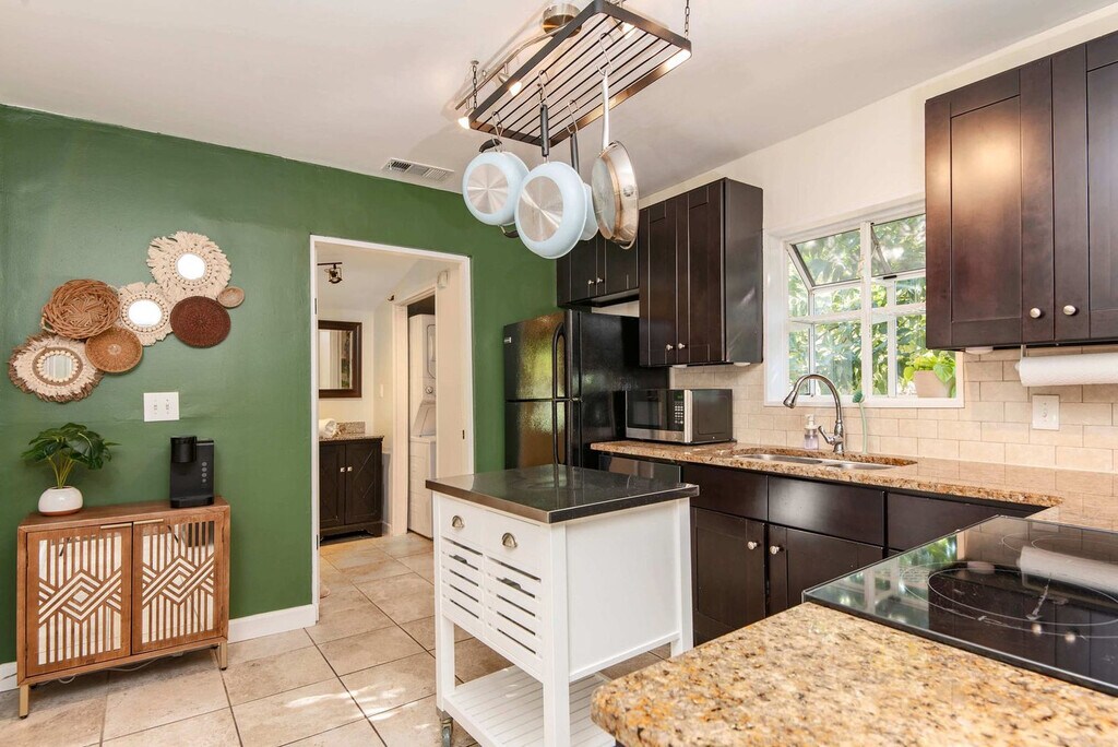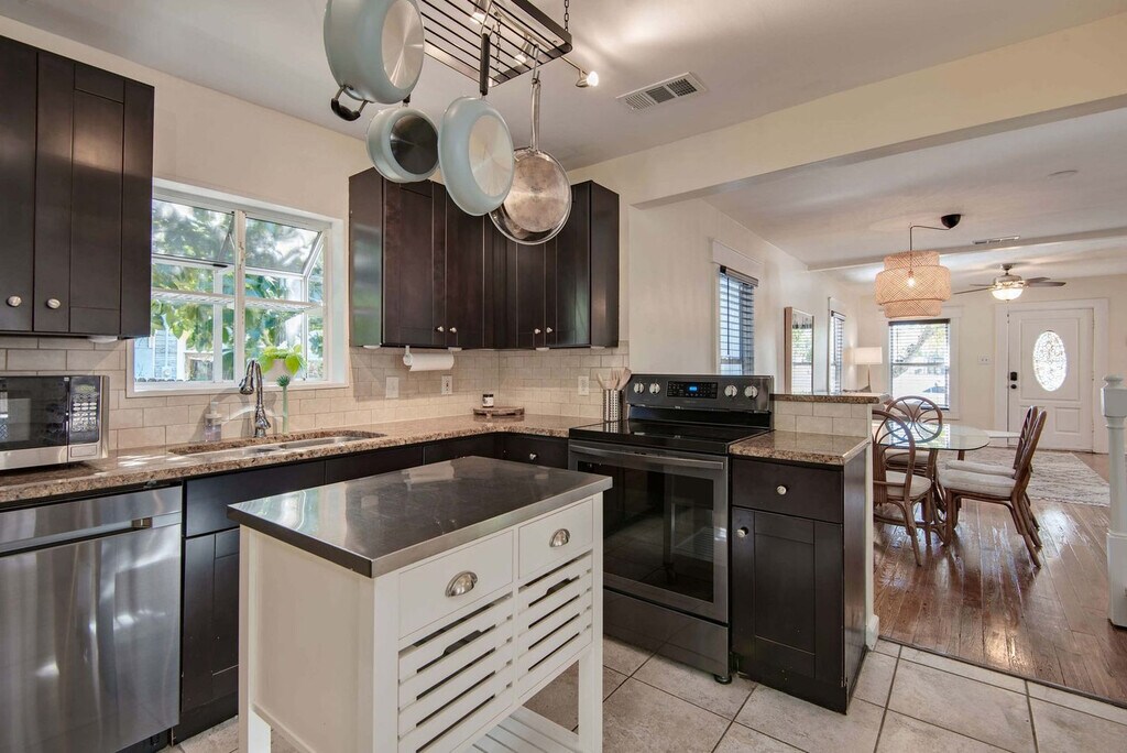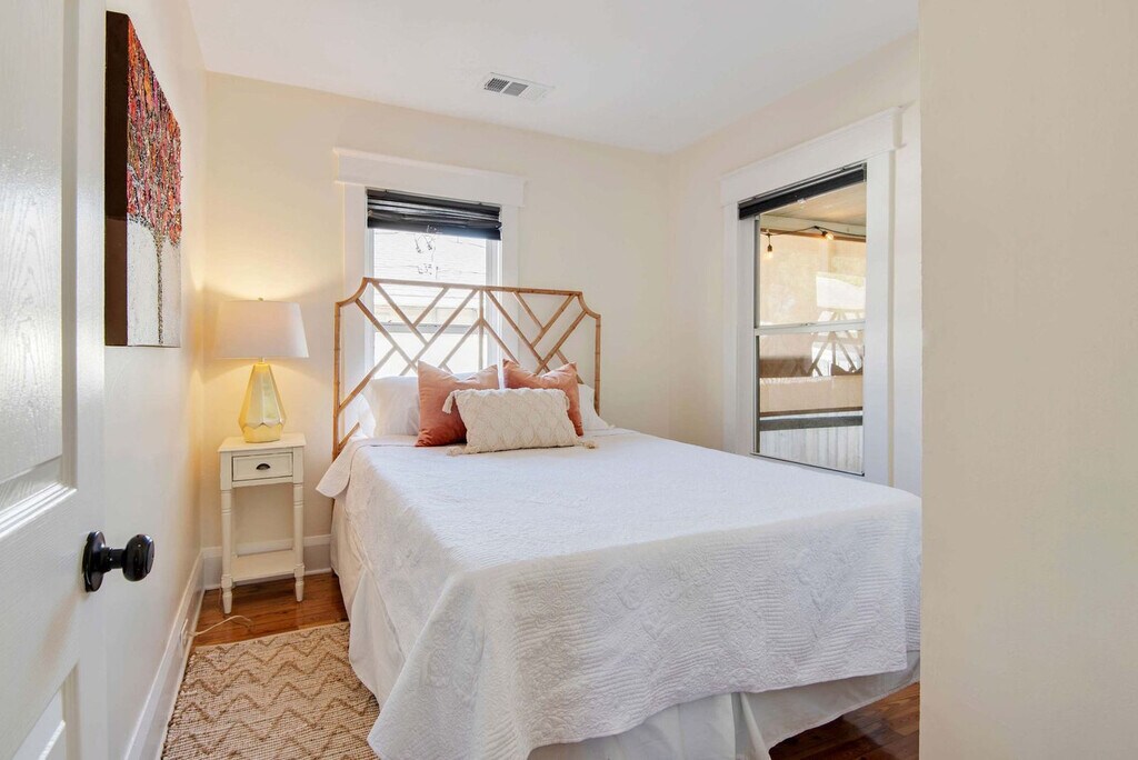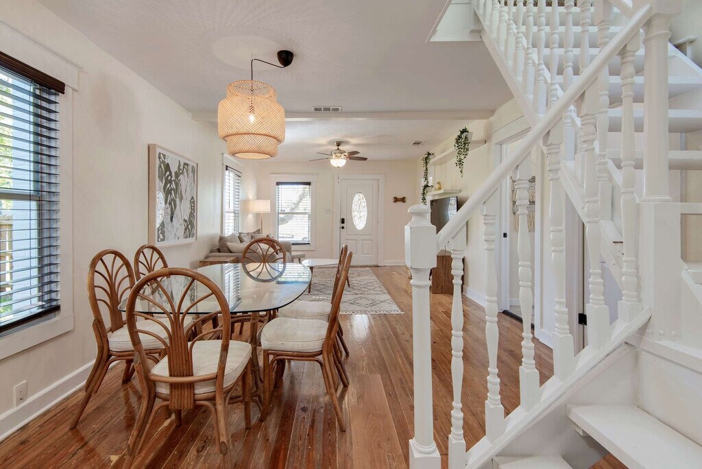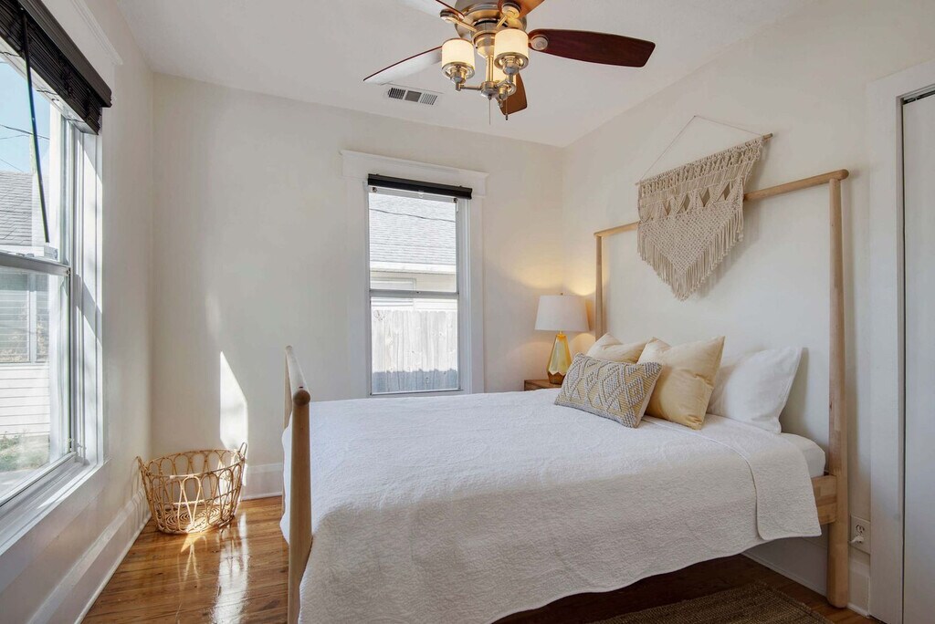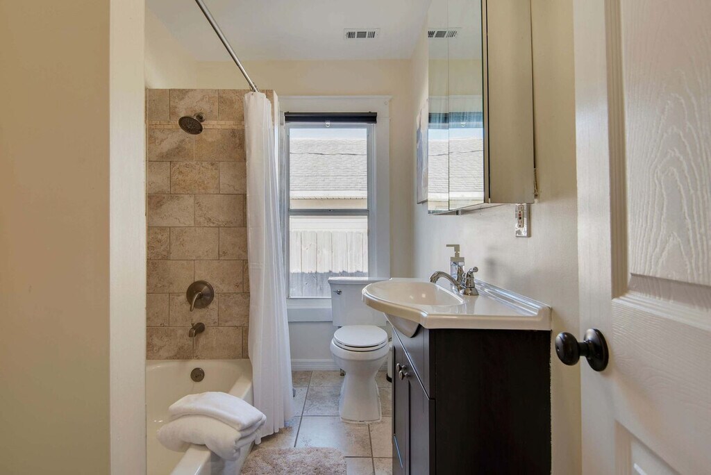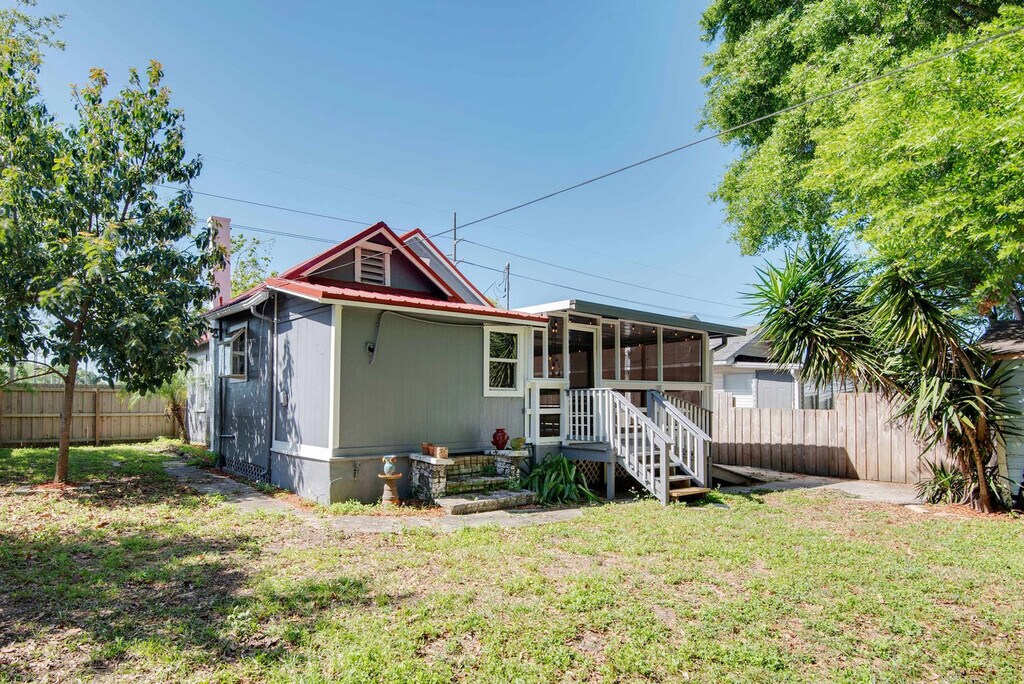 Welcome to this charming 3-bedroom, 2-bath bungalow nestled in the heart of Tampa. With its inviting screened porch, cozy boho interiors, and private fenced yard, this home is the perfect retreat for families, professionals, or friends looking to feel at home while staying close to the action. The bungalow comfortably sleeps up to 6 guests and features 2 full bathrooms for easy mornings. Designed for comfort and connection, this home blends natural textures with a relaxed Florida feel. It offers 3 bright bedrooms, including 2 Queen bedrooms and a Queen plus Twin combo, all with fresh linens and a warm, welcoming style. The 2 full baths are stocked with essentials, and the fully equipped kitchen includes cookware, utensils, a dishwasher, a microwave, and a Keurig coffee station. The open-concept living and dining area features hardwood floors, a streaming-ready Smart TV, and ample seating for gathering. Outdoor living is a highlight, with a large screened porch adorned with string lights and lounge seating, plus a fenced backyard perfect for pets. Additional amenities include a washer/dryer, central AC and heating, and driveway parking for 2+ vehicles. This pet-friendly home welcomes dogs with a pet fee of $100 per pet per stay, or per month for stays exceeding 28 days. Permits for professional video or photo shoots can be requested for a fee. Contact us for more information. Situated in a quiet residential pocket of Tampa, this home is just 10 minutes from Downtown, Busch Gardens, USF, and Amalie Arena. Within 5 minutes, you'll find grocery stores, coffee shops, and plenty of local dining options. Major hospitals, parks, and shopping are also close by, making this a convenient spot for both leisure and work travel. Driving is the easiest way to get around Tampa, with free driveway parking for 2+ cars available. Popular rideshare services are widely available and typically arrive within minutes. If you're headed to the beaches, expect about a 15-minute drive to Ben T. Davis or 45 minutes to Clearwater and St. Pete. The home features easy, contactless check-in with a personalized code, and our team is available 24/7 for assistance. Quiet hours are from 8 PM to 8 AM, and noise levels must stay below 80 decibels. Smoking indoors and the use of fireworks are prohibited, with a designated smoking area outdoors 15 ft away from the property. Smoking violations or the presence of smoke smell may incur a $250 remediation fee minimum. Only guests listed on the reservation are allowed on the property, and any additional guests must be notified in advance. Misuse of the AC system, including setting it lower than 68 degrees, may incur additional fees. Violation of any house rules may result in removal from the home without a refund. Fast WiFi with speeds over 400 Mbps is available, making it easy to work from home or stream your favorite shows on the Smart TV.