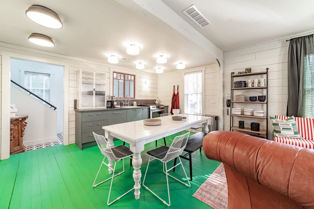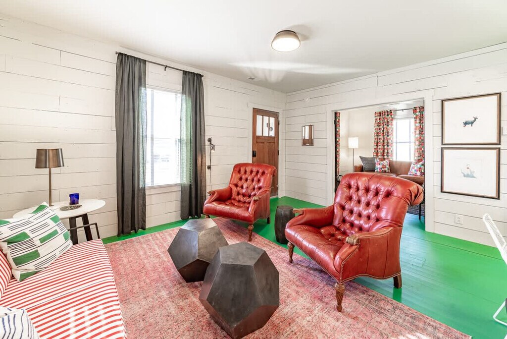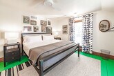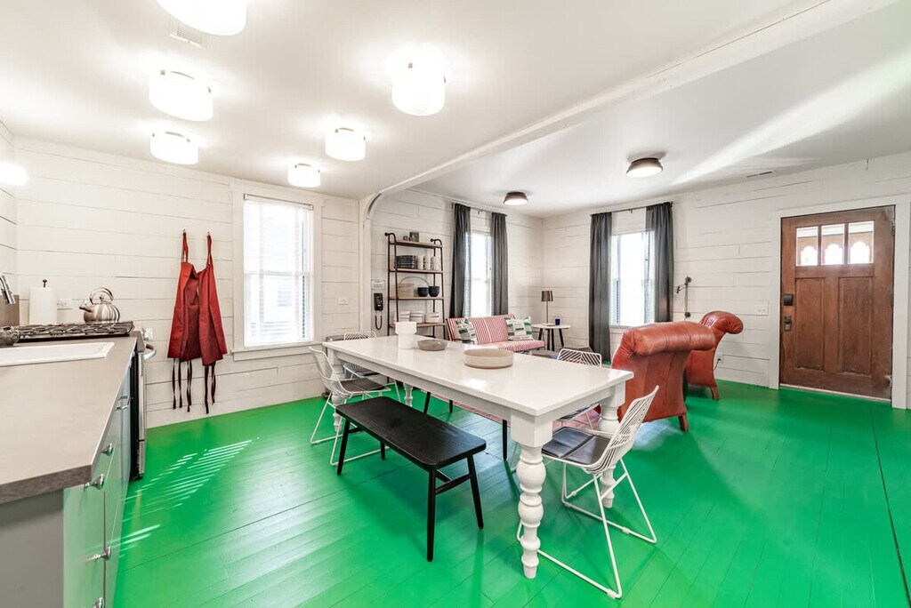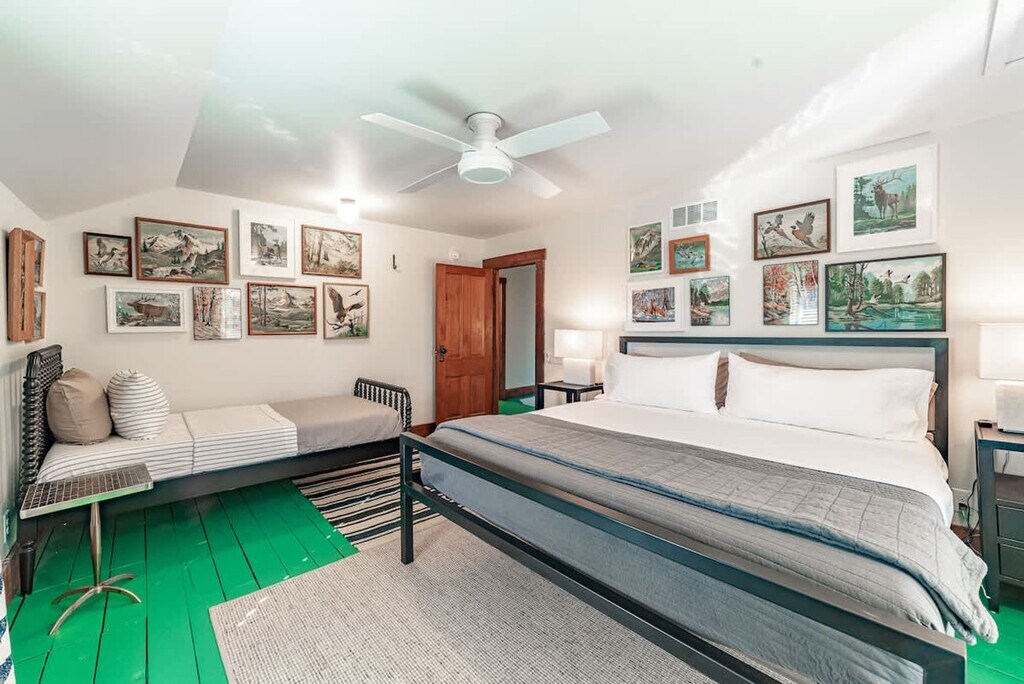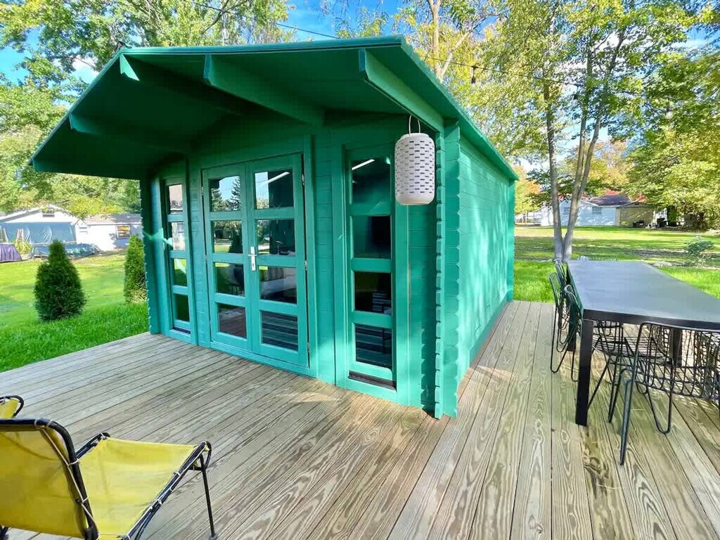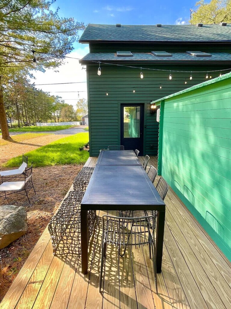 Feel at home in this beautiful, stylish, and basically brand-new home from the 1870s. This home features 3 bedrooms and 2 baths to accommodate up to 7 guests and is conveniently located one block from Three Oaks Main Street and adjacent to the Journeyman Distillery. Professionally designed, this home features multiple spots to entertain and relax, including indoor and outdoor dining tables, comfortable beds, and great Wi-Fi. The main floor features a charming vestibule, an open-concept living room, a dining room for 8, a kitchen, a cozy den with a TV, and a unique double-height rear addition. The exterior features a striking solid wood lodge building that comfortably holds 6 people for TV or game playing, a long outdoor dining table for 8, a firepit, and a unique outbuilding devoted to yard games. All of the furnishings are premium, and the art collection is like nothing else on the local market. Please note that the grill, outdoor furniture, fire pit, and exterior lodge are not available between mid-November through the end of April. The neighborhood directly surrounds the Journeyman Distillery and event center. In true Michigan resort town fashion, the neighborhood is a welcoming mix of affluent second-home owners, homes that are rented, and local residents who have lived on the street for years. The village of Three Oaks has on-street parking restrictions in place for 2–5 AM. It is recommended that all guests park in the driveway area. Please show respect to the neighbors by limiting outside noise after 10 PM and do not play amplified music outside of the home at any time. The village has strict rules regarding outdoor fires; please keep the screen tightly fitted over the top of the firepit. Do not host additional friends or have any kind of party without prior permission. The property is absolutely non-smoking on the inside, and smoking is not allowed in the outdoor buildings. Any indoor smoking will incur a fine of $250. For any guests looking to use recreational marijuana, it is advised that you research local laws about how to do so legally. [SI]