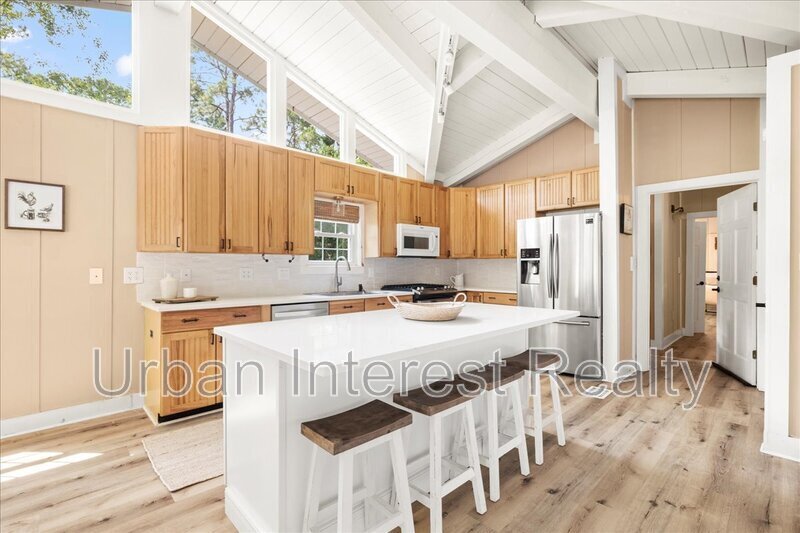 This is a gorgeous home sitting on a quiet cul-de-sac with a fenced back yard and a large screened front porch. Clerestory windows and exposed ceiling beams create a bright and open living area. The home is complete with an updated kitchen, bathrooms, and new flooring throughout.The third bedroom and bathroom can be closed off and turned into a fully functional studio with a private entrance and lock-off access through the laundry room. All residents are enrolled in the package for $50/ month which includes renters liability insurance, credit building with timely rent payments, up to $1M Identity Theft Protection, HVAC air filter delivery (for applicable properties), move-in utility concierge service, our resident rewards program, and more! More details upon app.
