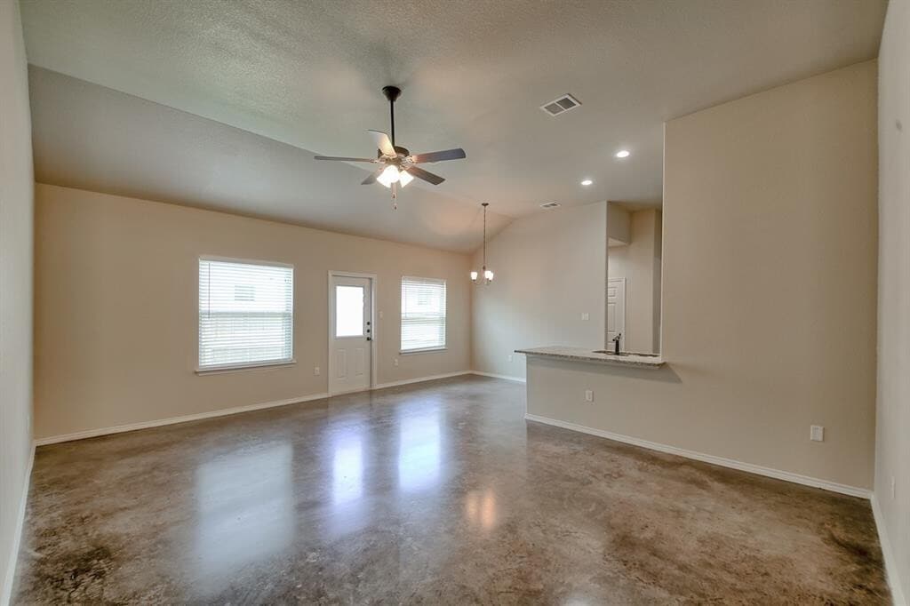 Property features 3 bedrooms, 2 full bathrooms, 2 car front entry garage with private fenced backyard. Spacious family and dining area, 11-foot ceilings in living room, 10-foot ceilings in master bedroom, polished stained concrete flooring, granite counter-tops, stainless kitchen appliances including refrigerator, dishwasher, range, microwave, 42 upper kitchen cabinets, with tile backsplash, under cabinet lighting, separate pantry. Rear covered patio is perfect for entertaining. Year Built 2019. Quick access to 1-35, close to schools, shopping and restaurants. APPLY ON-LINE TODAY!"