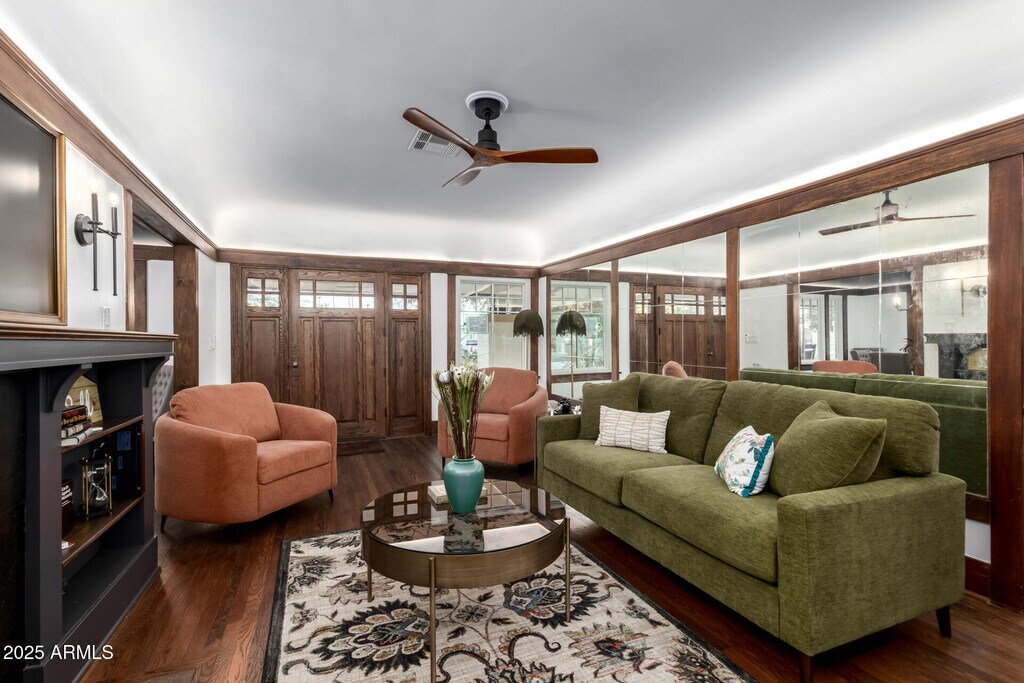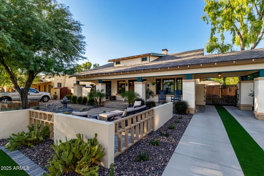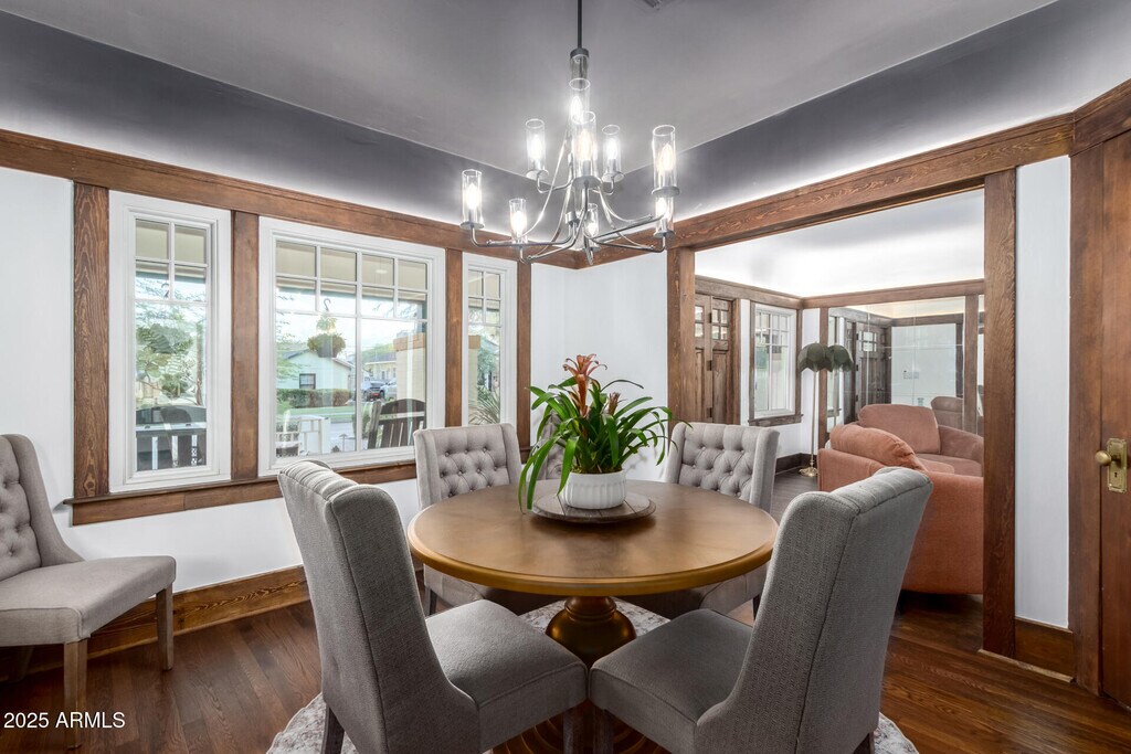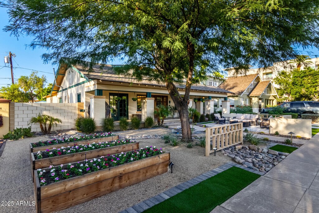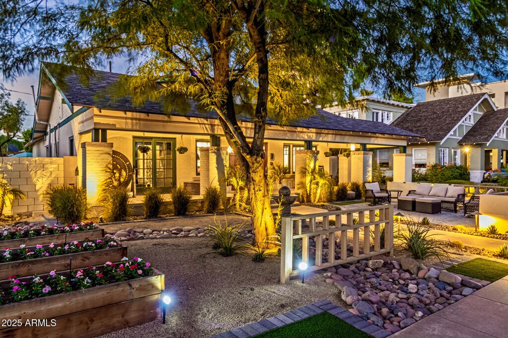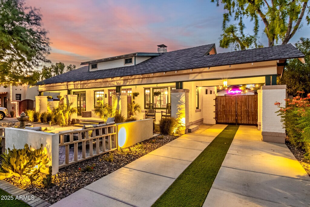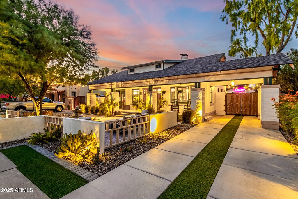 Step into timeless elegance in the Willo Historic District. The Walter Stone House,a restored 100+ year-old Craftsman bungalow,sits on a large private cul-de-sac lot with a guest house,1.5-car garage,swimming pool,spa,and extensive landscaping. This 3 bed,3 bath home blends original hardwood floors,two fireplaces,custom millwork,French doors,and preserved mirrored wallsrumored to have been added by Frank Lloyd Wrightwith thoughtful updates. The dining room sparkles with a chandelier,while the den is ideal for an office or study. Kitchens and baths have been remodeled with high-end appliances,stone counters,and designer finishes. The expansive front porch and backyard retreat complete this rare blend of historic character and modern livability near downtown Phoenix.