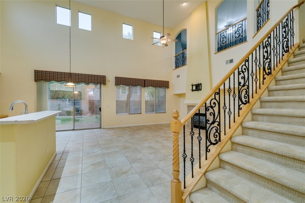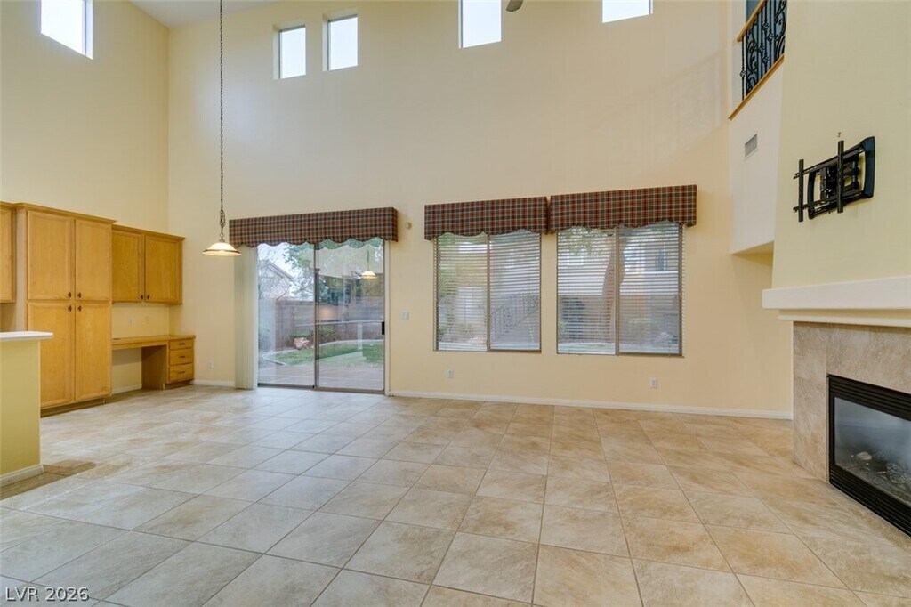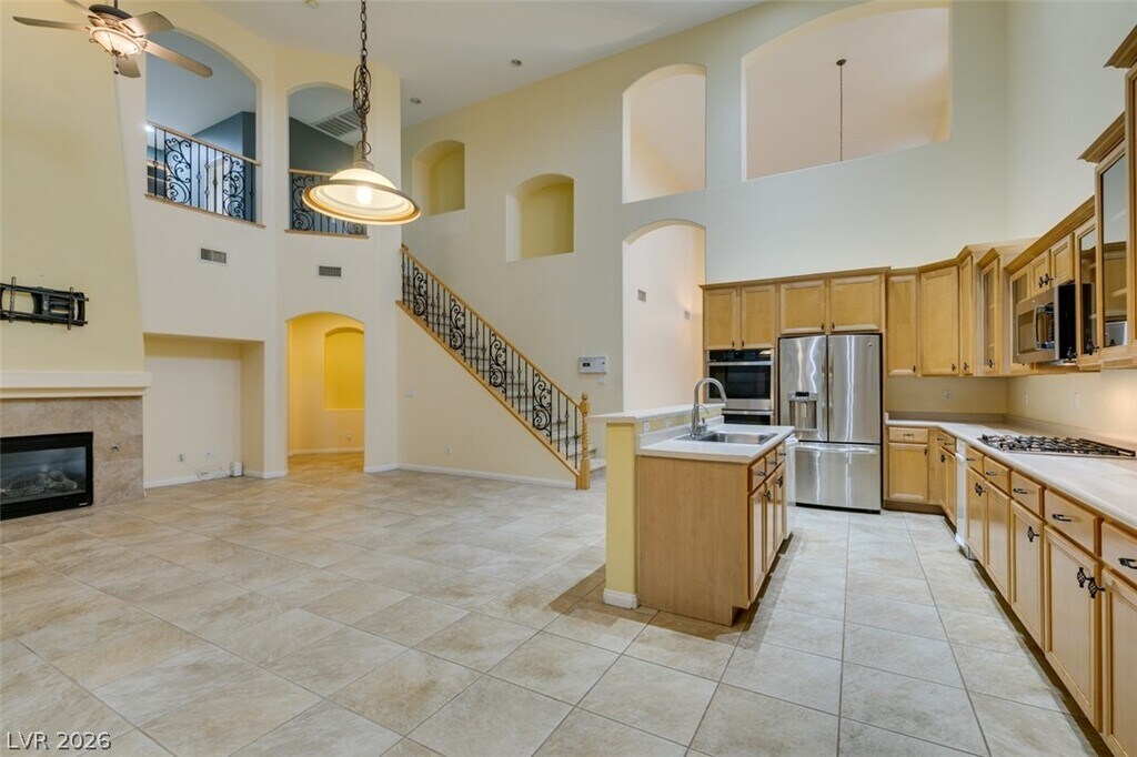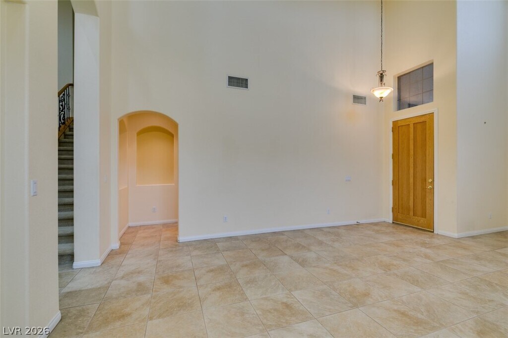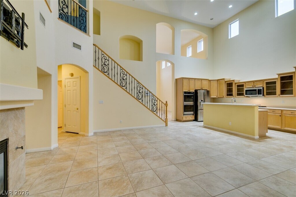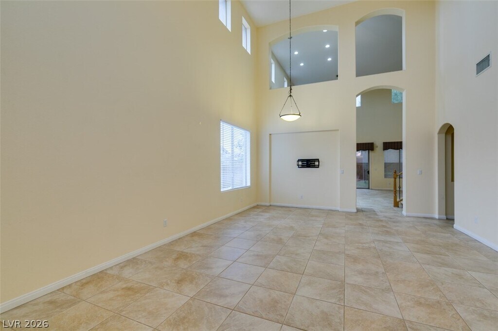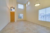 Located on a corner lot in a gated Southern Highlands community, this 4 bedroom, 4 bath home offers a spacious and functional layout with a 3 car garage. The floor plan includes separate living and dining rooms, a large loft with a built-in wet bar, and an open kitchen with ample cabinet space, double ovens, microwave, and generous counter space. The family room features a fireplace, and the primary bedroom is downstairs with an en suite bath offering double sinks, a vanity, soaking tub, and separate shower. Owner plans to convert landscaping to desert/xeriscape to help reduce tenant water costs.