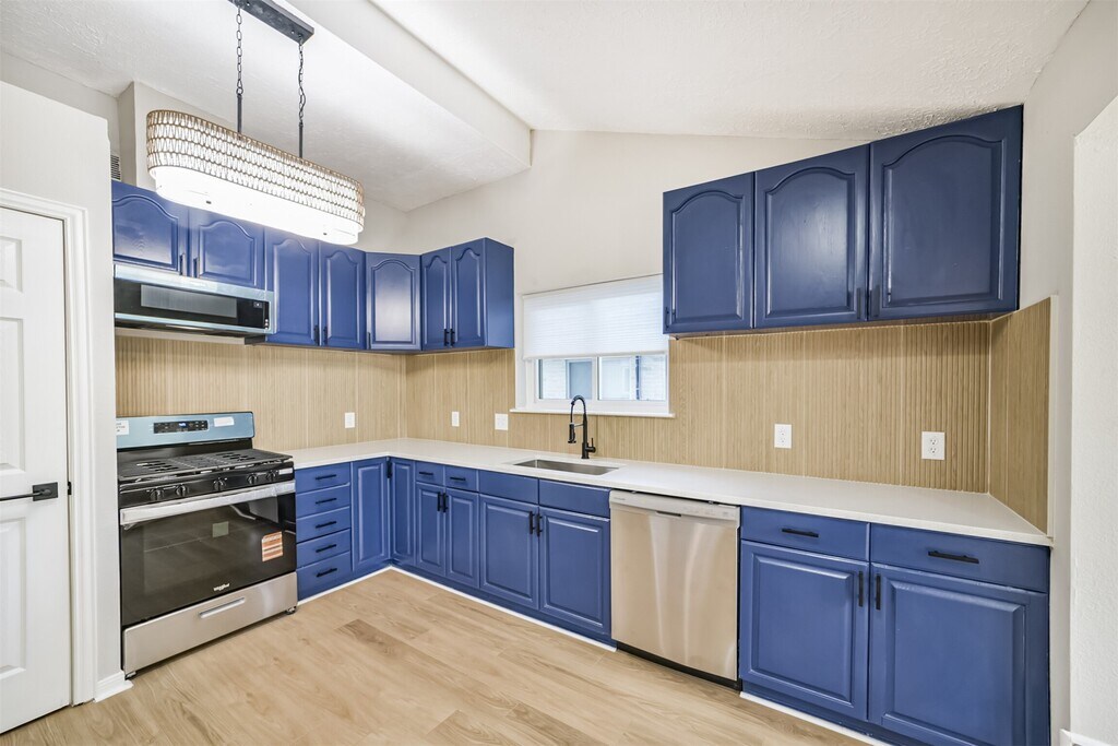 This beautifully remodeled one-story home is available for immediate move-in and designed for comfortable everyday living. Fresh paint,new flooring,and thoughtful updates throughout create a warm,inviting feel. With over 2,000 sq. ft.,the home offers 4 bedrooms,2 bathrooms,plus a flexible bonus space ideal for a home office,guest room,or playroom.Vaulted ceilings and a striking rock fireplace add character,while the split-level layout provides a separate living area perfect for relaxing or entertaining. The island kitchen features stainless steel appliances,a walk-in pantry,and modern finishes. Both bathrooms include stylish upgrades and dual sinks. Enjoy double patio doors leading to a private backyard with a pergola,fenced green space,and room to unwind. Quick and easy application process. Schedule your tour today and make this home yours. MLS# 44736118