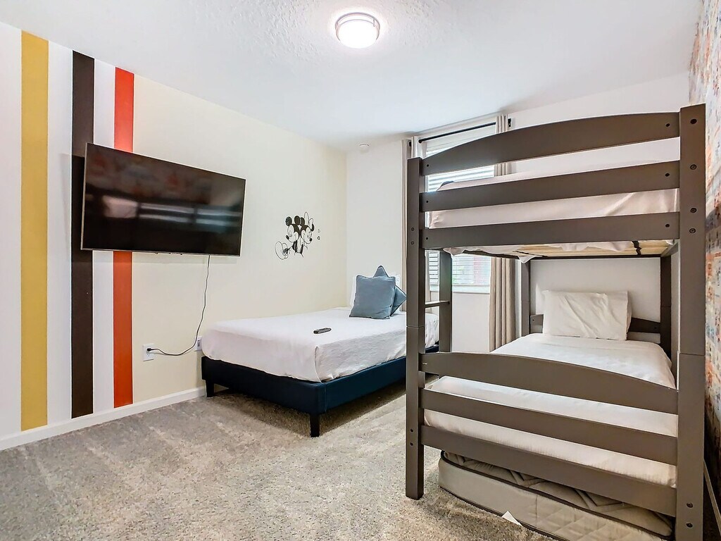 Experience the excitement of the new Epic Universe park, just minutes away from this luxurious apartment. Enjoy unbeatable comfort with a fully equipped kitchen, air conditioning, and high-speed internet. The apartment features a master bedroom with a king-size bed and en-suite bathroom, a second bedroom with a bunk bed and full-size bed, and a living room with a sofa bed. Relax on the patio with furniture provided, and take advantage of the free parking and game room. Feel at home with full complimentary access to all the wonderful resort amenities, including a gym, heated swimming pools, lazy river, water park, splash pad, and more. The apartment is equipped with three smart TVs, a washer/dryer, ironing supplies, and hangers. The kitchen is fully equipped with an island and dining area for six people. Enjoy unlimited access to two luxury clubhouses, with some amenities available for an additional fee, such as the spa center, golf, and restaurant. Optional services include pack and play, high chair, early check-in, and late check-out, available at an extra cost. Located just steps away from a second clubhouse and less than a mile from fun attractions, this apartment offers easy access to local attractions such as Sea World, Universal Studios, and Disney World. Nearby outlets, supermarkets, and local restaurants provide convenience, while transportation options like Uber and Lyft are readily available. Guests must be at least 18 years old to book a reservation. No unregistered guests, smoking, or pets are allowed inside. The property is exclusively for vacation use and does not permit filming without prior authorization. The apartment features a side entry and is keyless, with a code provided prior to check-in. Our team is available to ensure everything goes as planned during your stay. A safety protocol is in place to ensure the well-being of guests and personnel, with professional cleaning performed to high standards.
